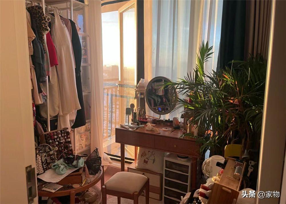 一側做開放式搭衣架,面對窗戶的位置則放上一張化妝桌,在這裏穿衣搭配還是挺愜意的,另外,開頭所說的不到1㎡的露天陽臺,就是在這間小小的衣帽間裏。