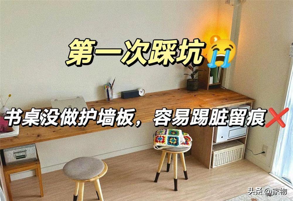 書桌底部,之前就沒想着做護牆板這回事兒,用了也就有個半年時間,桌底就會被踢得一塌糊塗,全是腳印鞋印,平時看不見,但注意到時就總覺得彆扭。