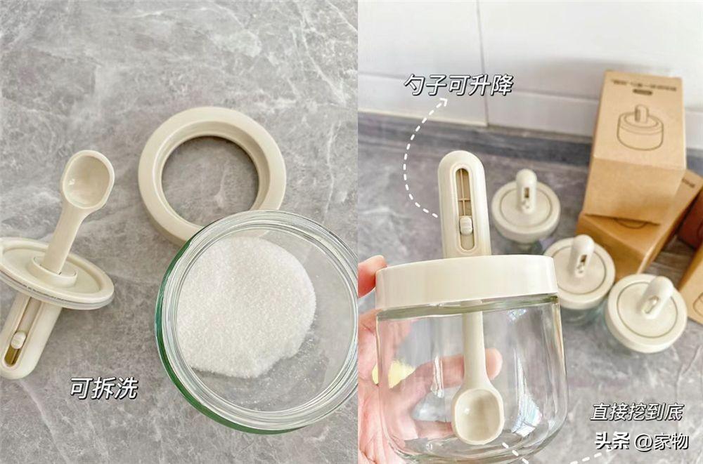 最後是這種帶伸縮勺的調料罐啦,它看起來很普通,但和那種固定勺子的調料罐相比,最大的優點就是勺子可以伸縮,蓋蓋子的時候不會有被調料頂住的困難,細節到位。