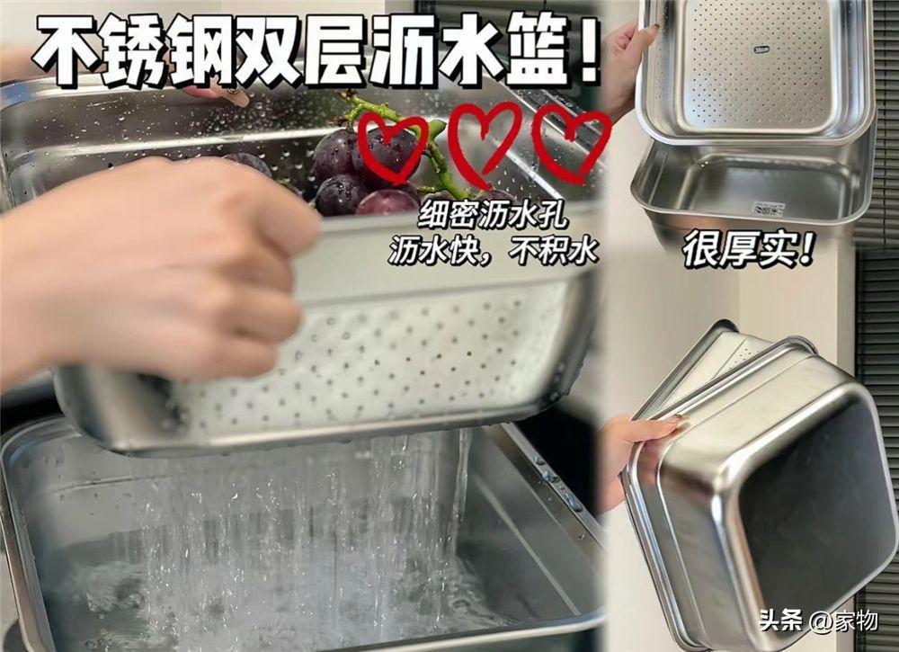 同樣是個不鏽鋼的小件,它是一個雙層的瀝水籃,上面一層是方形的盆體,可以洗菜洗水果,清洗乾淨後提起來就能瀝水了,本身不鏽鋼材質也比較耐用且不易沾染油污,好用!
