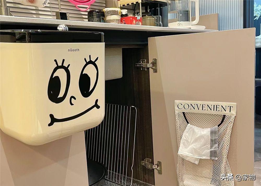 這其實是一組小東西,一個是在櫃門外面掛着,用來隨手丟棄檯面垃圾的東西,一個是在櫃門內部掛着的網兜,主要用來收納垃圾袋或塑料袋,我個人感覺都挺好用的。
