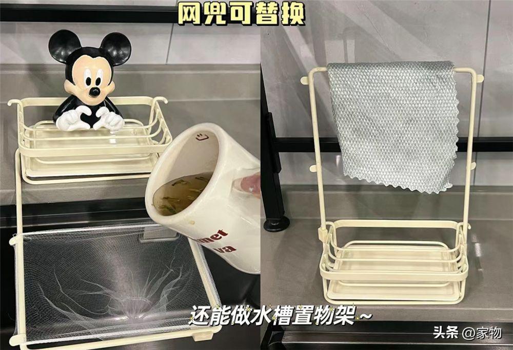 廚房的水槽旁白年,也可以放這種兩用式的網兜和支架,可以收納洗碗棉或者香皂,移動式的支架立起來就能掛抹布,放下來可以掛網兜,扔廚餘垃圾或者倒茶葉就方便多了。