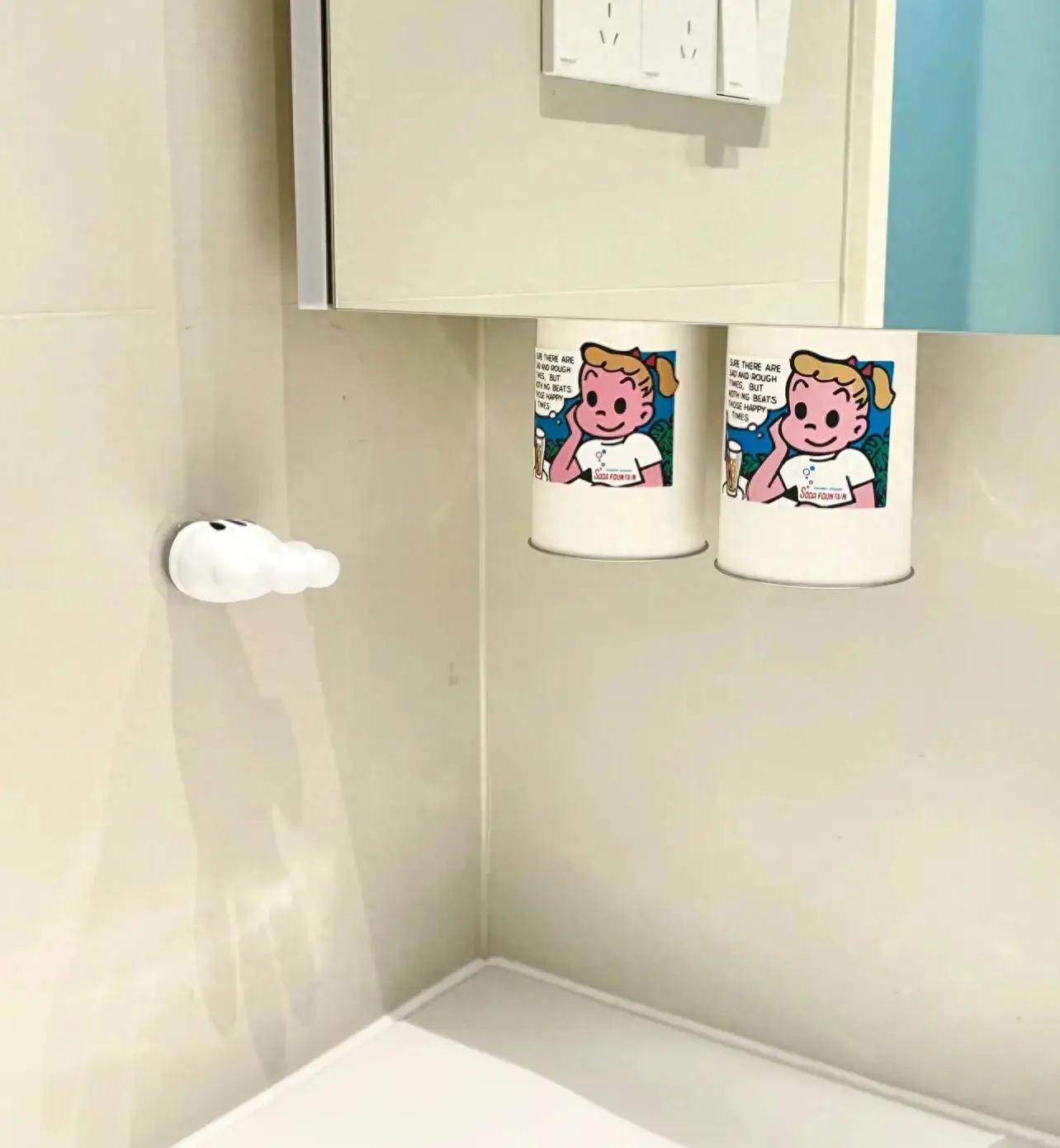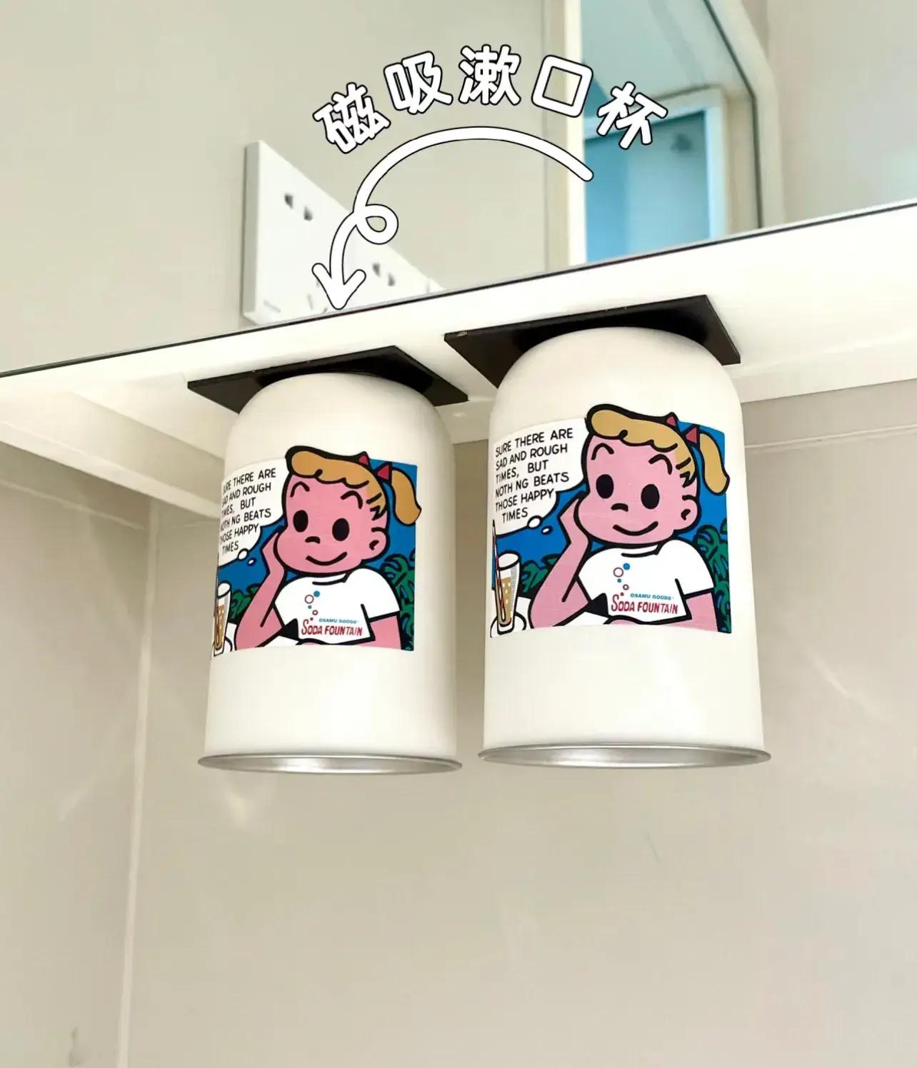 它是個磁吸漱口杯,自帶一片引磁片,杯子可以倒置吸附在鏡櫃或者櫃板上面。