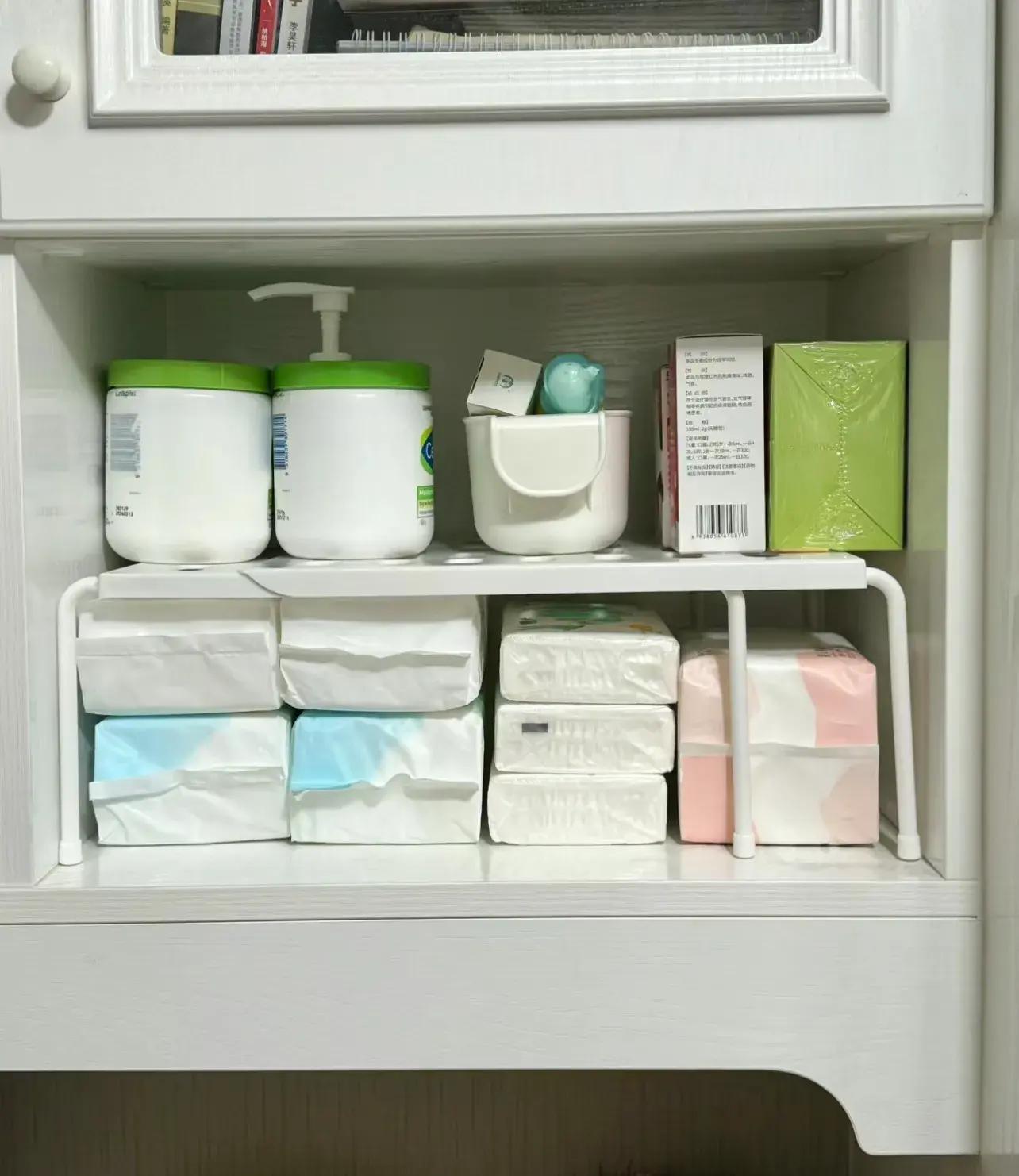 有了這個成功案例之後,再結合它可伸縮,不限尺寸的特點,我還給家裏的櫃子裏,也用上了這個置物架。成功的給櫃子,實現了擴容,把上面的空間也給利用起來了。