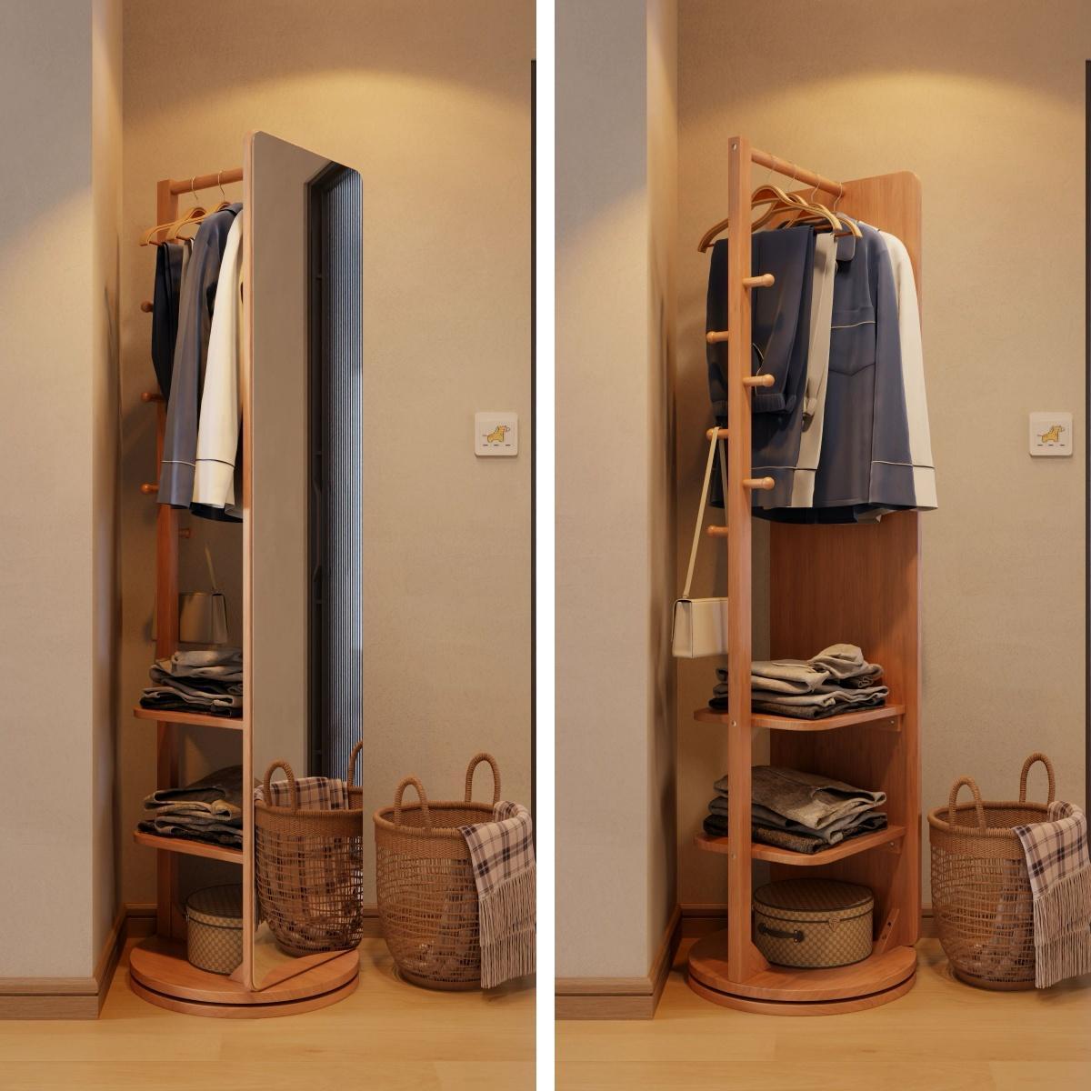 底部是圓盤結構,支持旋轉還帶全身鏡,並且自身有一定配重,不怕倒。中間採用了衣架掛衣的橫杆模式,下面還帶三層置物臺,這樣衣服包袋就能更有序的分類收納,不僅看着整潔,也不容易讓衣物鼓包。