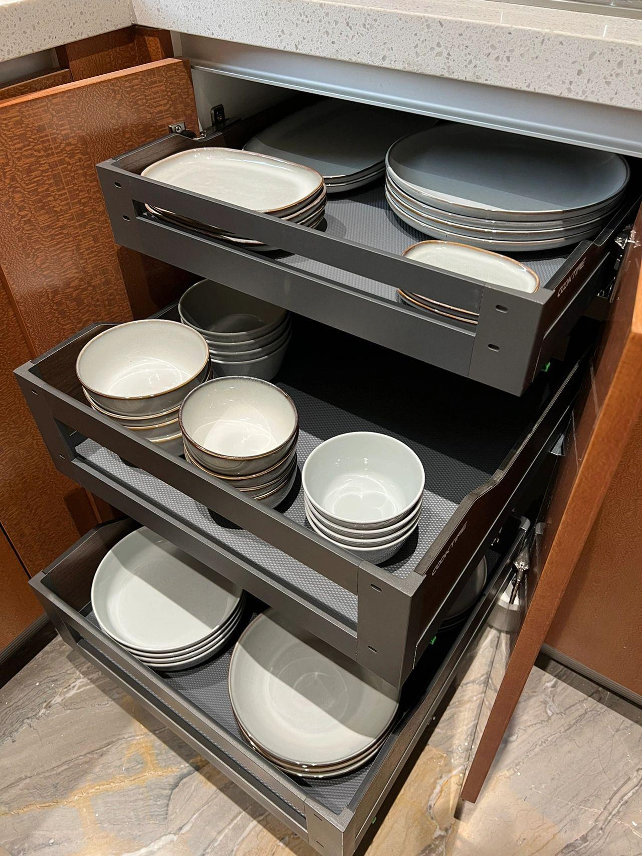 大表姐建議:與還不如直接選這種簡潔的平放抽屜,不僅清理方便而且一目瞭然,能做三層更節省空間,常用不常用的,大的小的碗盤也能更好的分類收納。