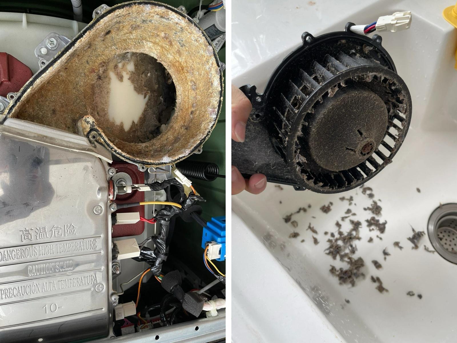 請師傅把機器拆開了才知道,媽呀!這風機裏全是各種噁心的污垢……坑就坑在洗烘一體機絕大多數都是無法過濾衣物上的毛絮和灰塵的。