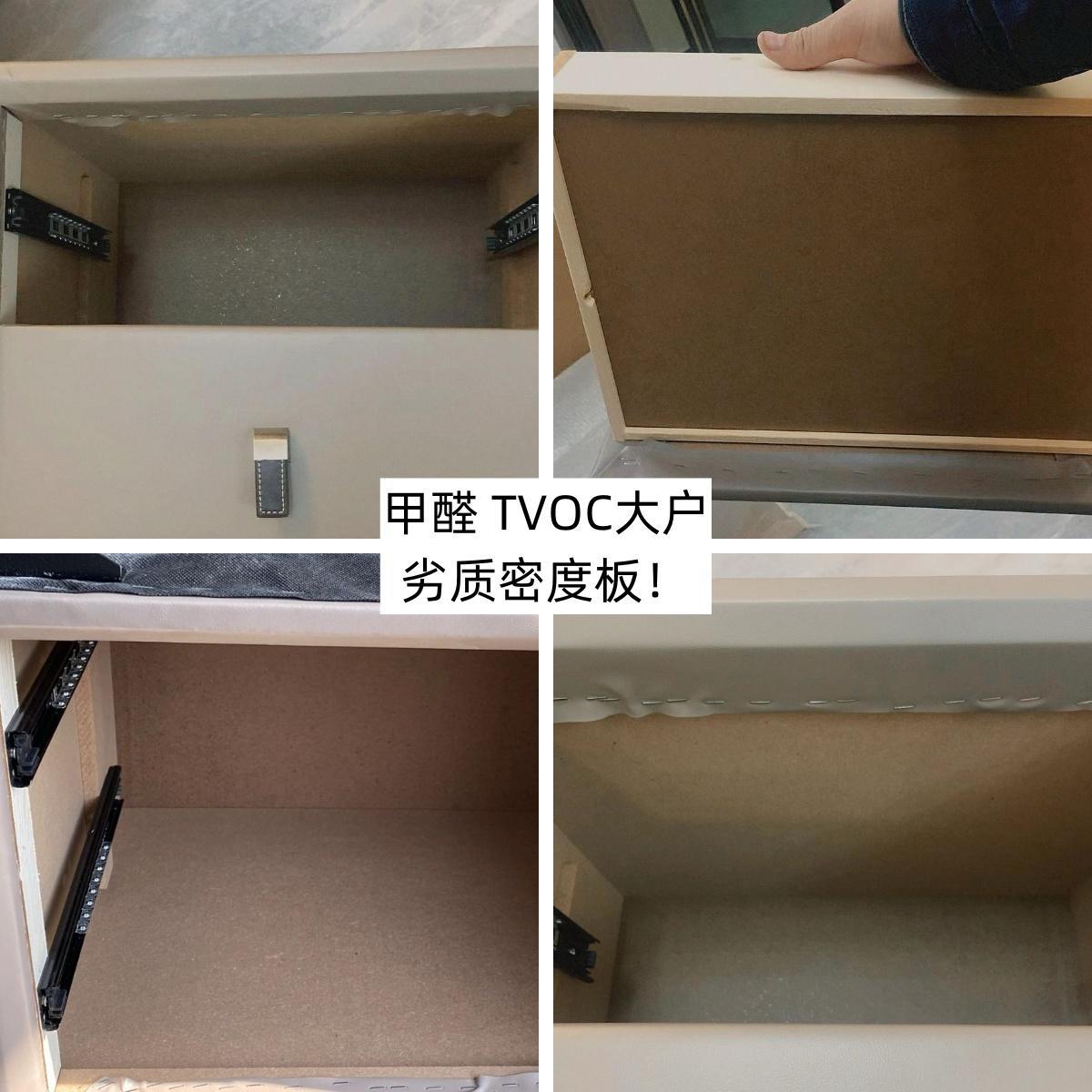 許多用戶反饋,家裏的軟包牀頭櫃用了七八年了,打開抽屜還能聞到刺鼻的氣味,想想都可怕,它但凡能給你用一點好木頭,外面都不會貼層皮。
