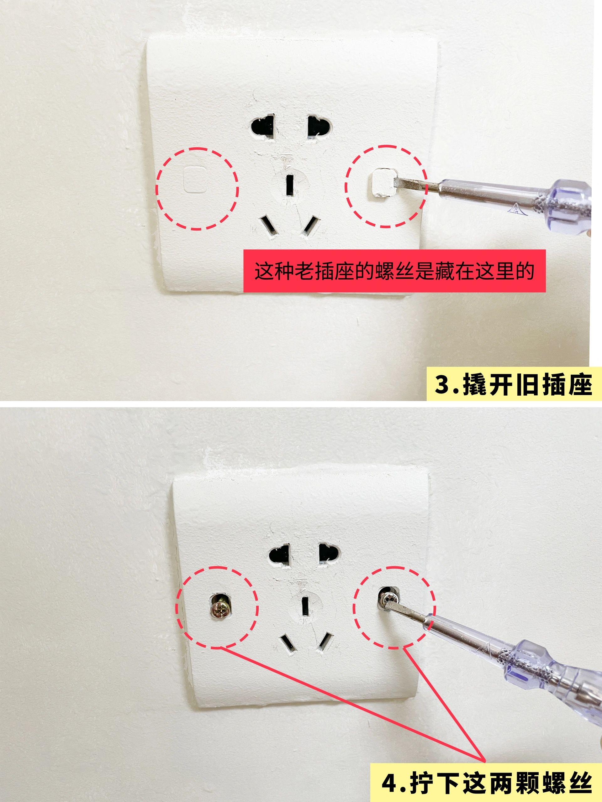 關閉電閘後,拿出你提前準備好的新插座,先撬開舊插座的面板,像一老式的插座螺絲是藏在下圖這裏的。一些新款的,可以從底部撬開。(用一字起即可)