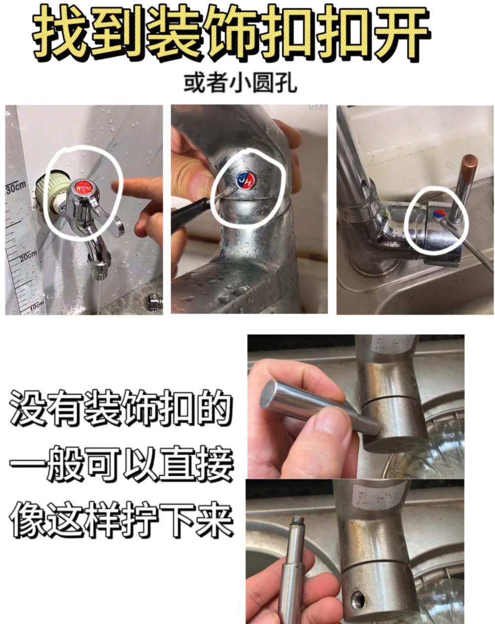 首先記得在維修前,要關閉家裏的總水閥。接着要找到它的裝飾孔蓋,摳開,可以看到裏面的螺絲孔,這裏需要用到“六角螺絲刀”逆時針把它轉開,然後打開把手蓋。