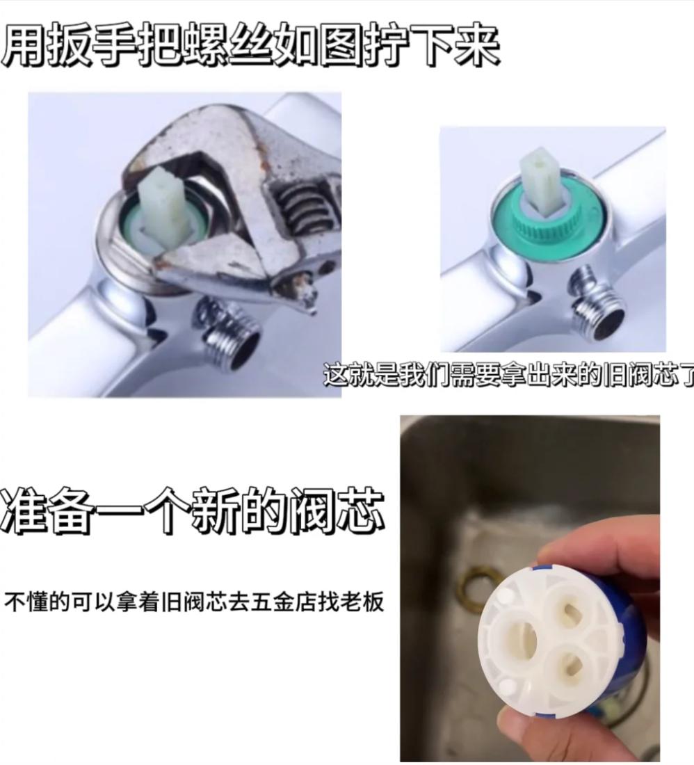 用扳手把閥芯上的螺絲擰下來,然後取下閥芯,換上一個新的閥芯。(閥芯可以直接去五金店買,10元左右就能買到質量不錯的)