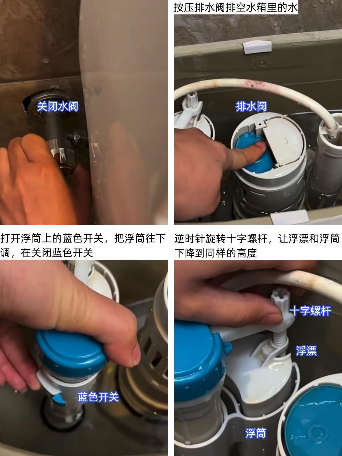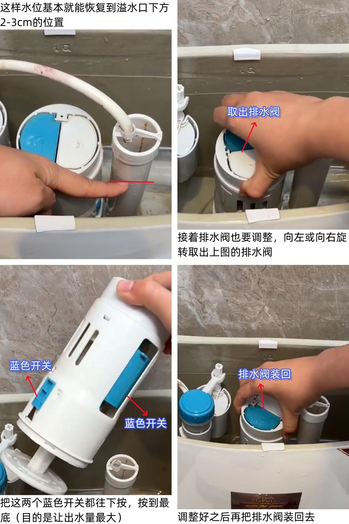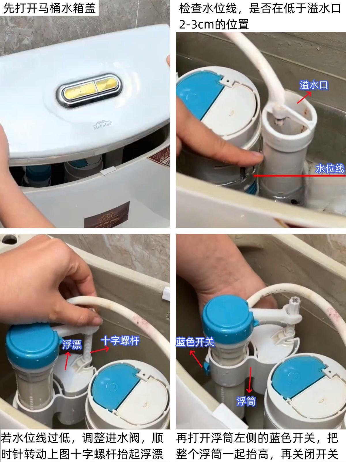 先關閉供水軟管閥門,然後打開馬桶水箱蓋檢查內部,重點參照上圖,檢查水位線的位置。如位置不達標,則開始調整上圖所示的左側十字螺桿和藍色開關,目的是讓浮筒和浮漂都抬高。