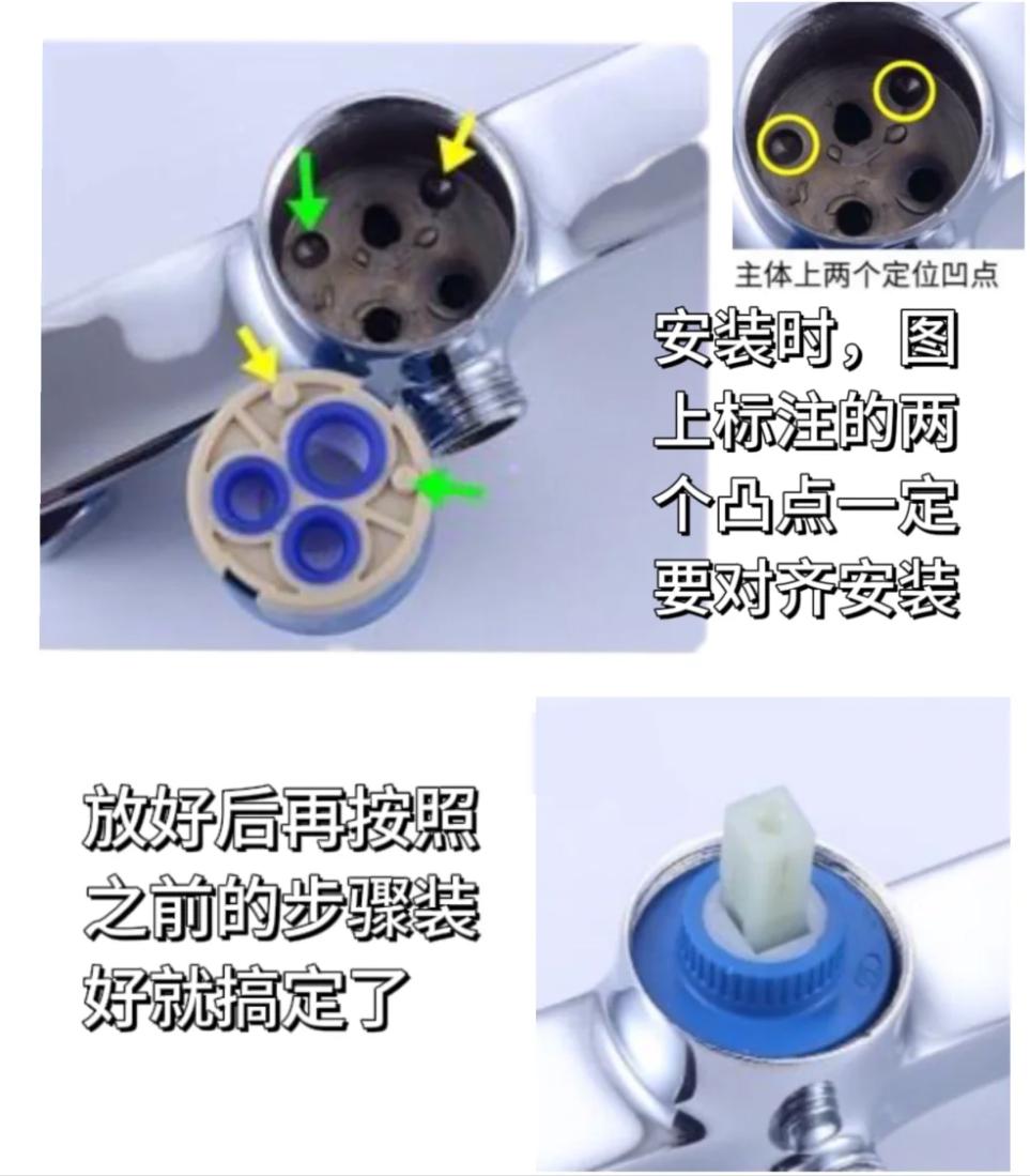 換閥芯時,一定要注意按上圖這樣對其,閥芯換好之後,再按之前的步驟逐步裝回去。這樣水龍頭就修好了,是不是很簡單,並沒有什麼難度呢?