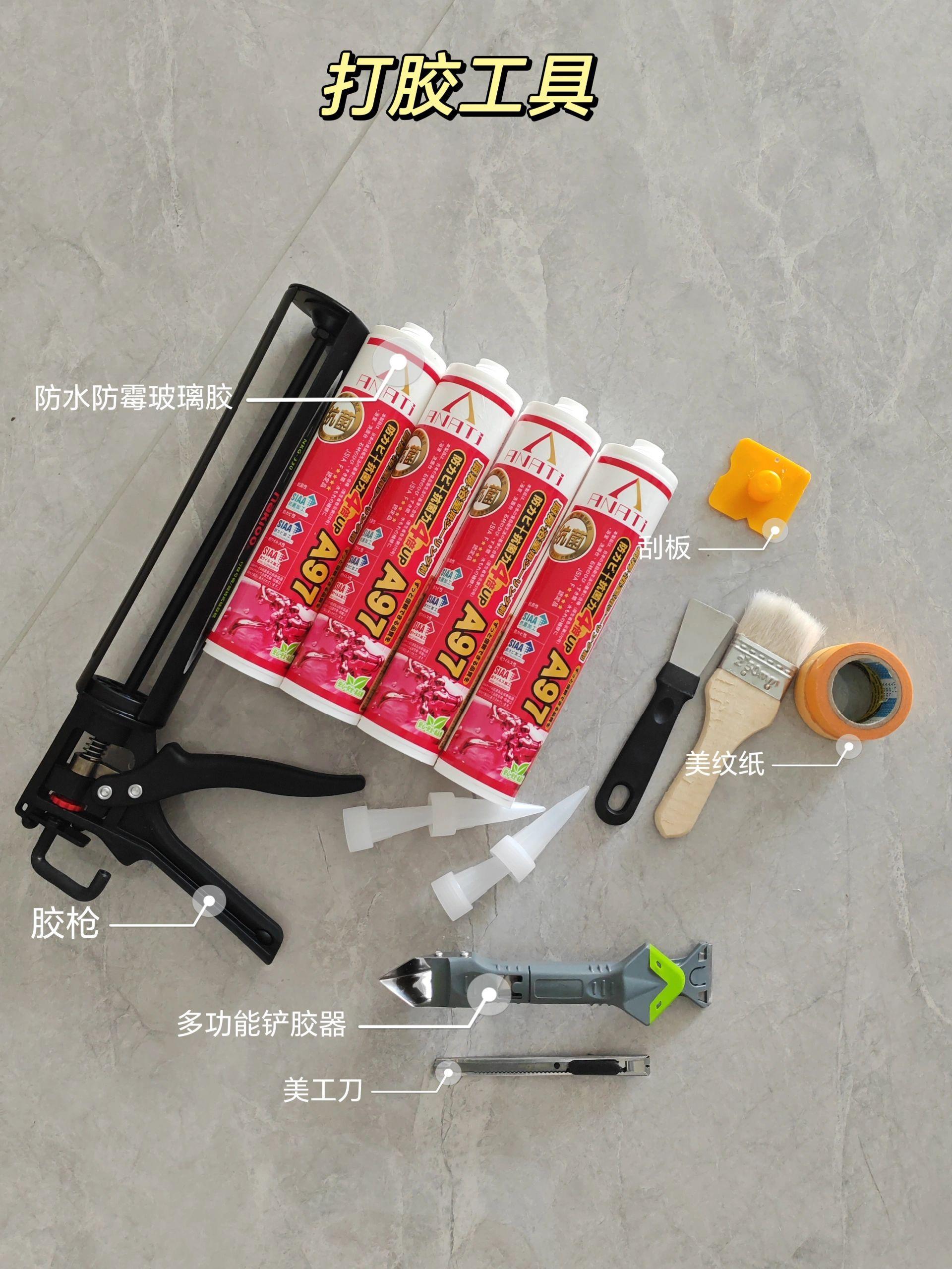 首先是準備好打膠工具,記得要選擇防水防黴的玻璃膠,如果量不大,一瓶玻璃膠足夠了,算上所有工具總成本幾十元。