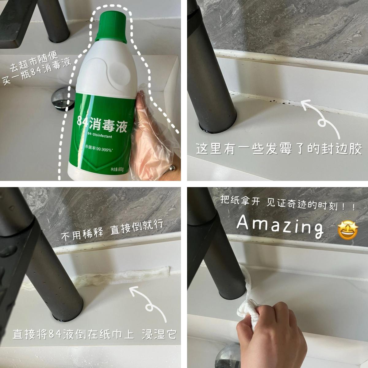 家裏打玻璃膠的位置如果發黴了,先別急着請人上門翻新。先試試84消毒液,這個幾乎家家戶戶都有,塗在黴菌的位置,蓋上衛生紙(蓋上保鮮膜也行),對於普通黴菌一般過4個小時,之後再揭開就能看到恢復如新了。
