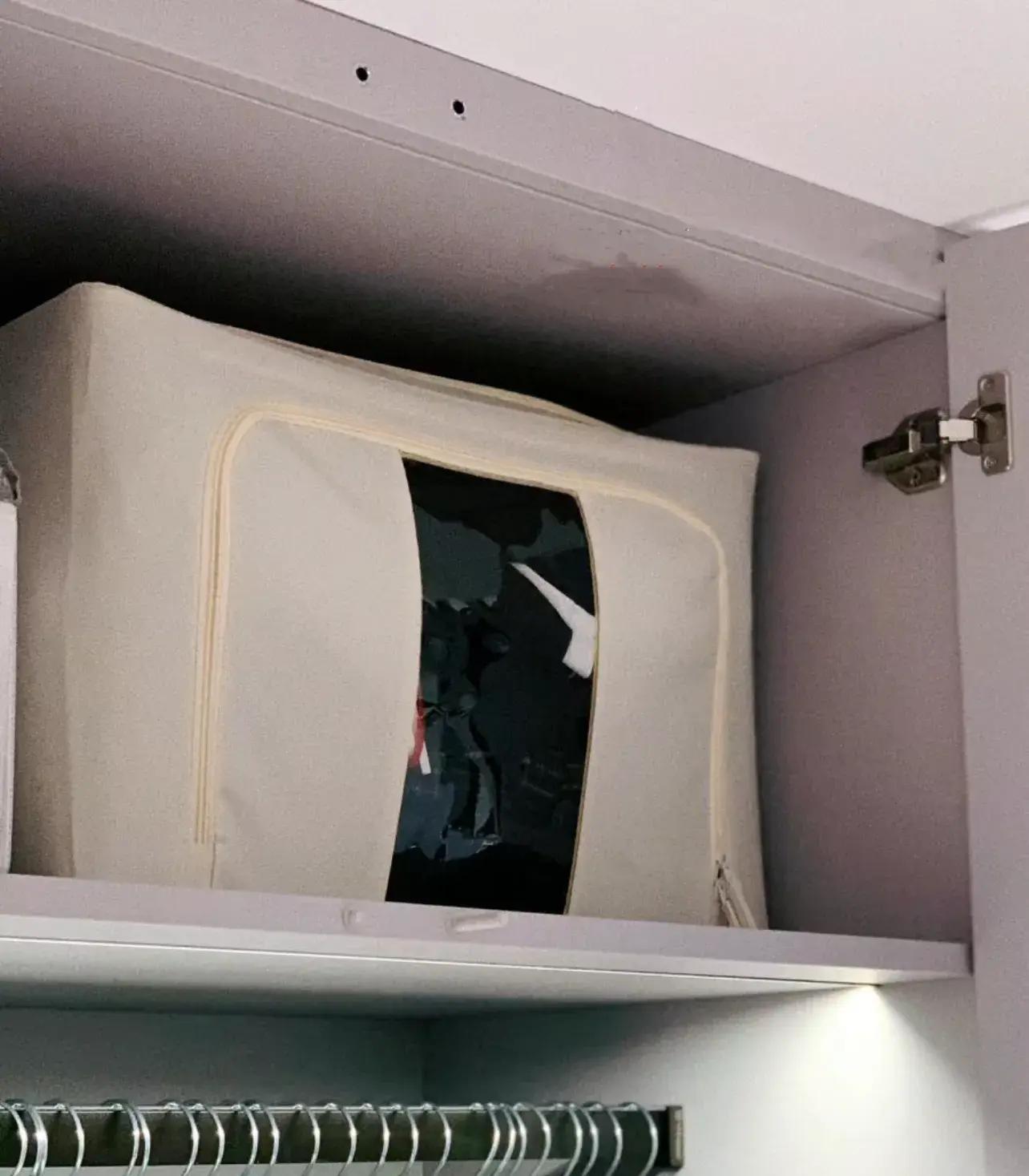 我都是利用棉麻收納箱,直接把接下來幾個季節不用的牀品、羽絨服、毛衣塞進去,然後放在衣櫃最上層。