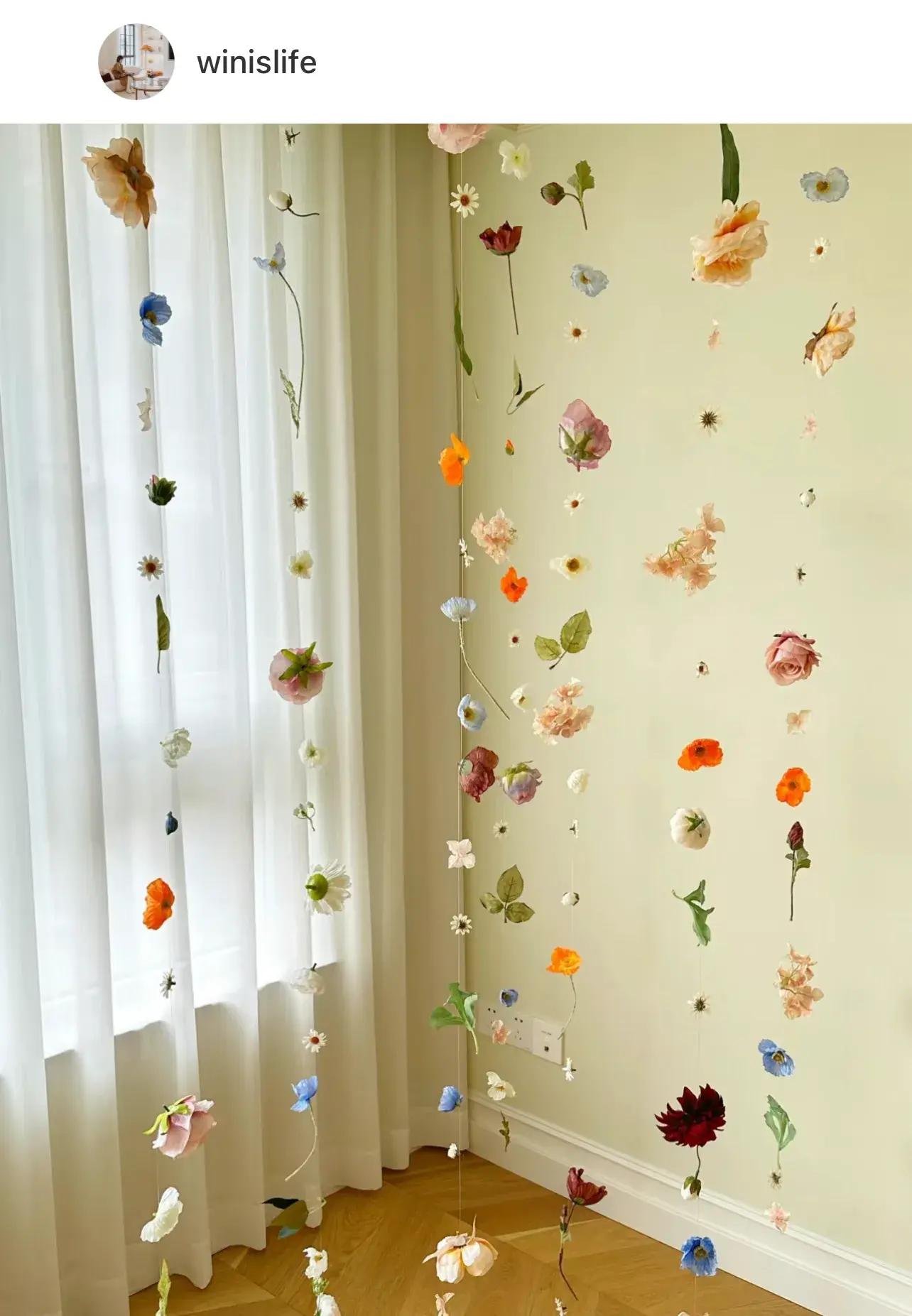 把仿真花,用熱熔膠,固定在串手串的彈力線上,然後再用小點膠,把彈力線粘在天花板上,效果美絕!