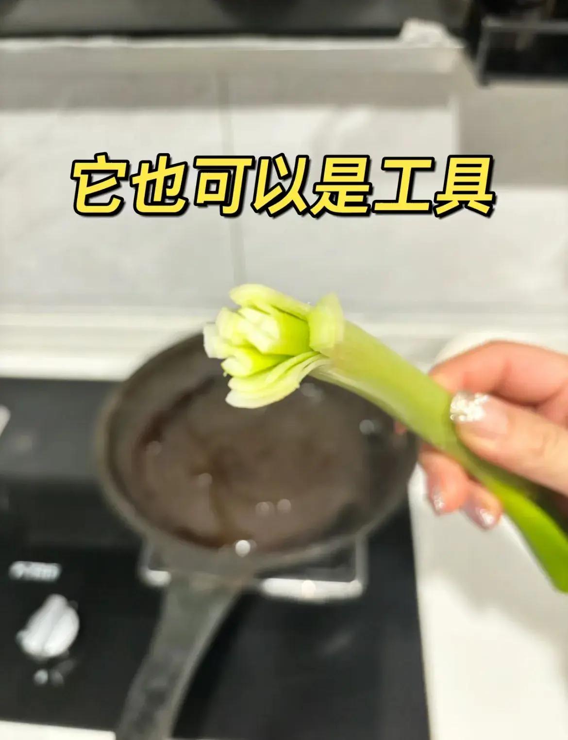 舉一反三,如果這頓飯不用蔥,也可以用筷子夾蘑菇,用土豆、香菜等一切這頓喫的食材刷,主打個就地取材、乾淨方便。
