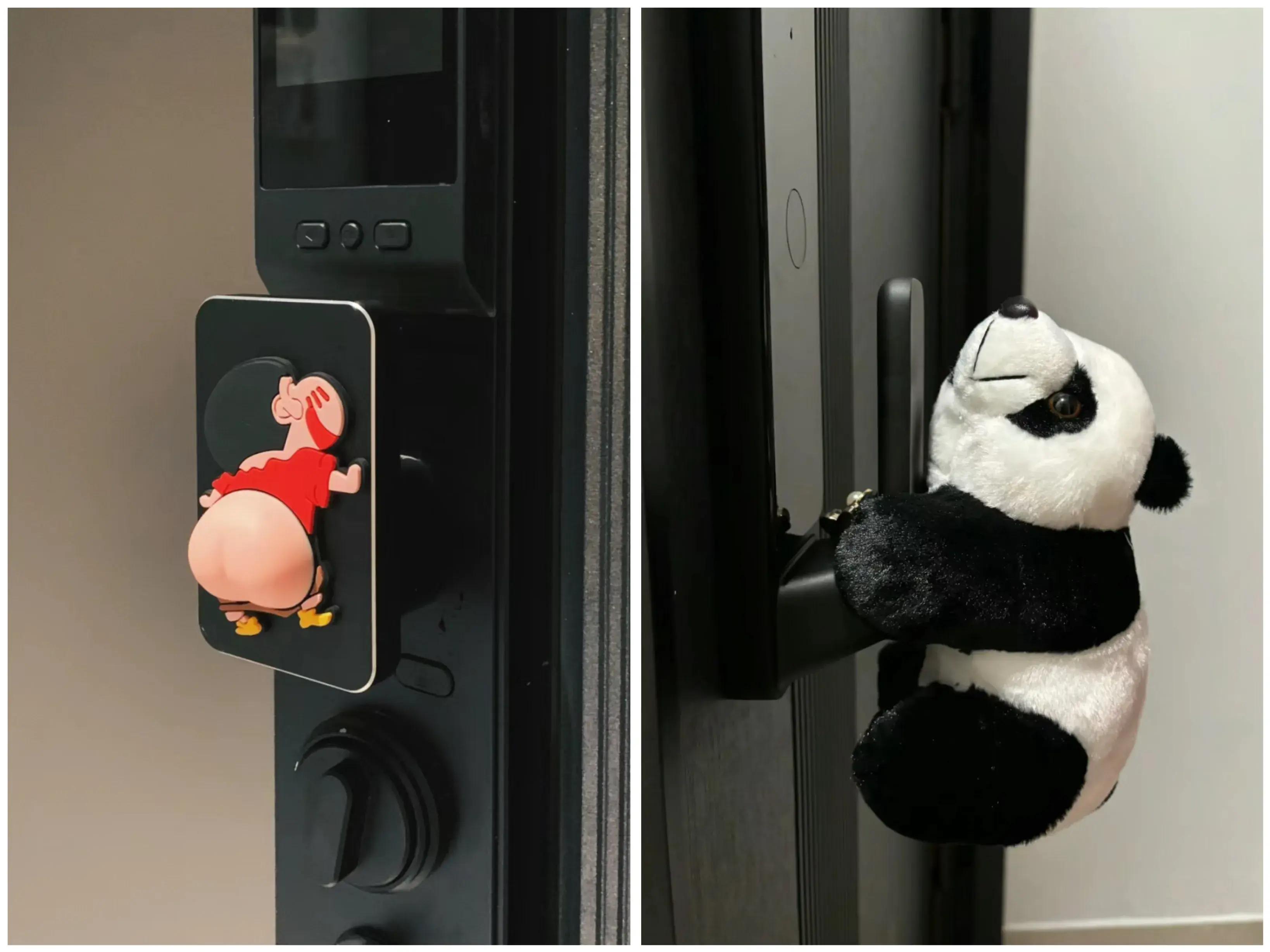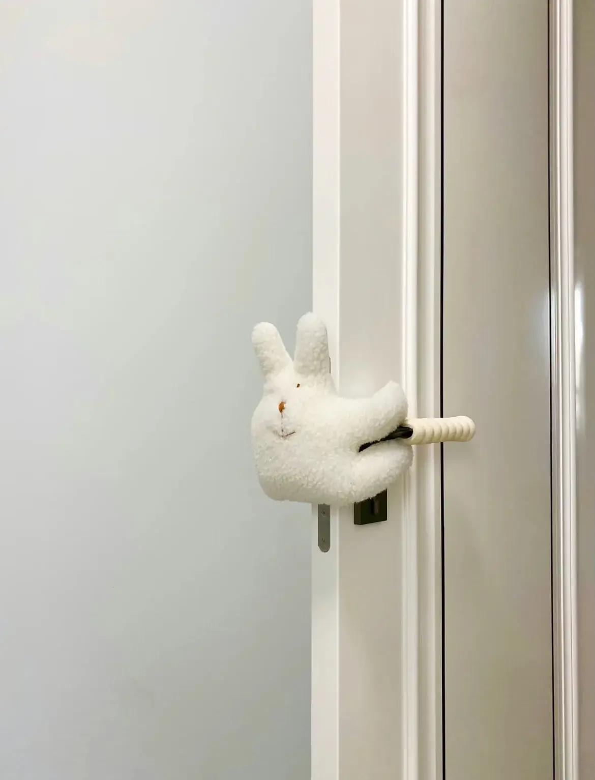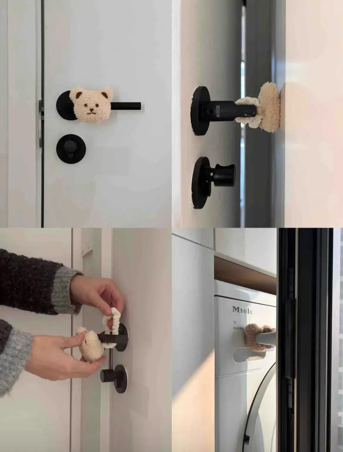 挑孩子的玩偶皮筋,綁在把手上就行,軟綿綿的玩偶完全能緩衝掉門的撞擊,還多少有些可愛在門上的。