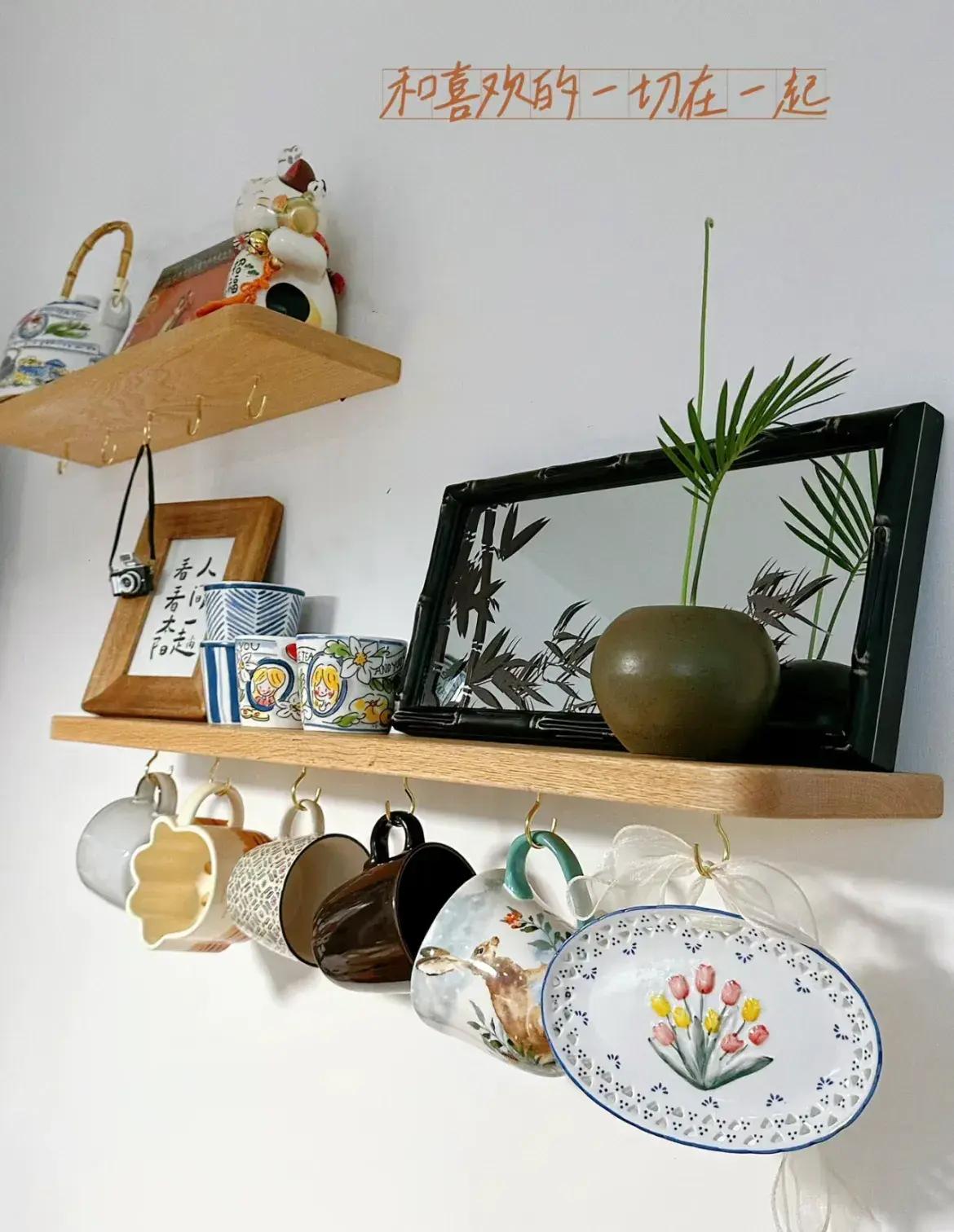 選擇置物隔板時,再挑這種下面帶掛鉤的,廚房小工具、杯具收納,也一併解決了,真的是實用又美觀。