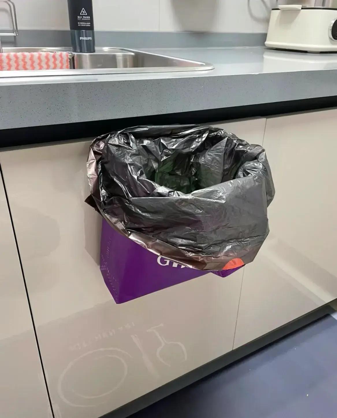 再套上垃圾袋,雙層防漏更保險,這不比伸縮款垃圾桶更靈活?而且,用完袋子扔掉也好,往裏一翻也罷,櫃門上看起來乾乾淨淨,廚房都找不到垃圾桶的痕跡。