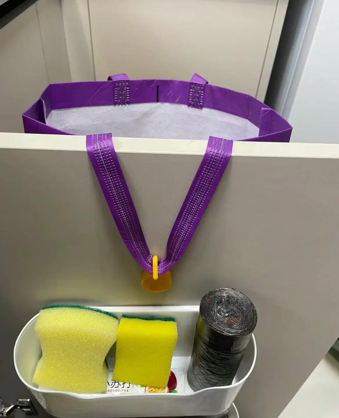 在櫃門內側,倒貼一個掛鉤,然後挑個質量好點、能支棱、不滲油的外賣袋,內掛外翻出去,妥妥地一個掛門垃圾桶就誕生了。