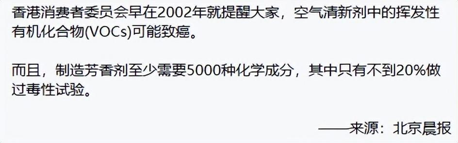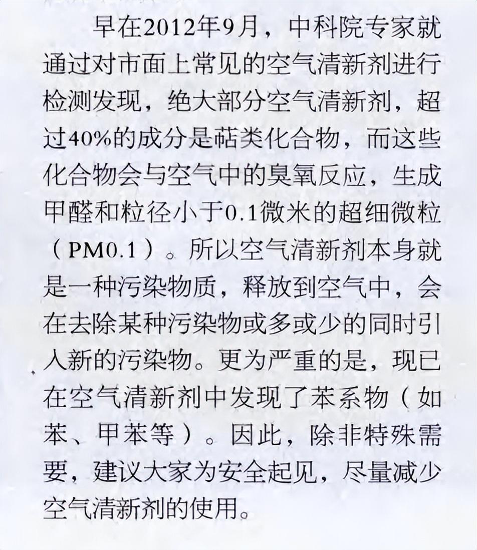 根據我查閱的相關資料顯示,早在2015年,鄭州大學化學系分析測試中心主任、博士生導師張書勝教授就指出,“各種空氣清新劑基本上都是由乙醚、香精構成的,只是通過散發香氣掩蓋異味,給人一種空氣被淨化的錯覺”。