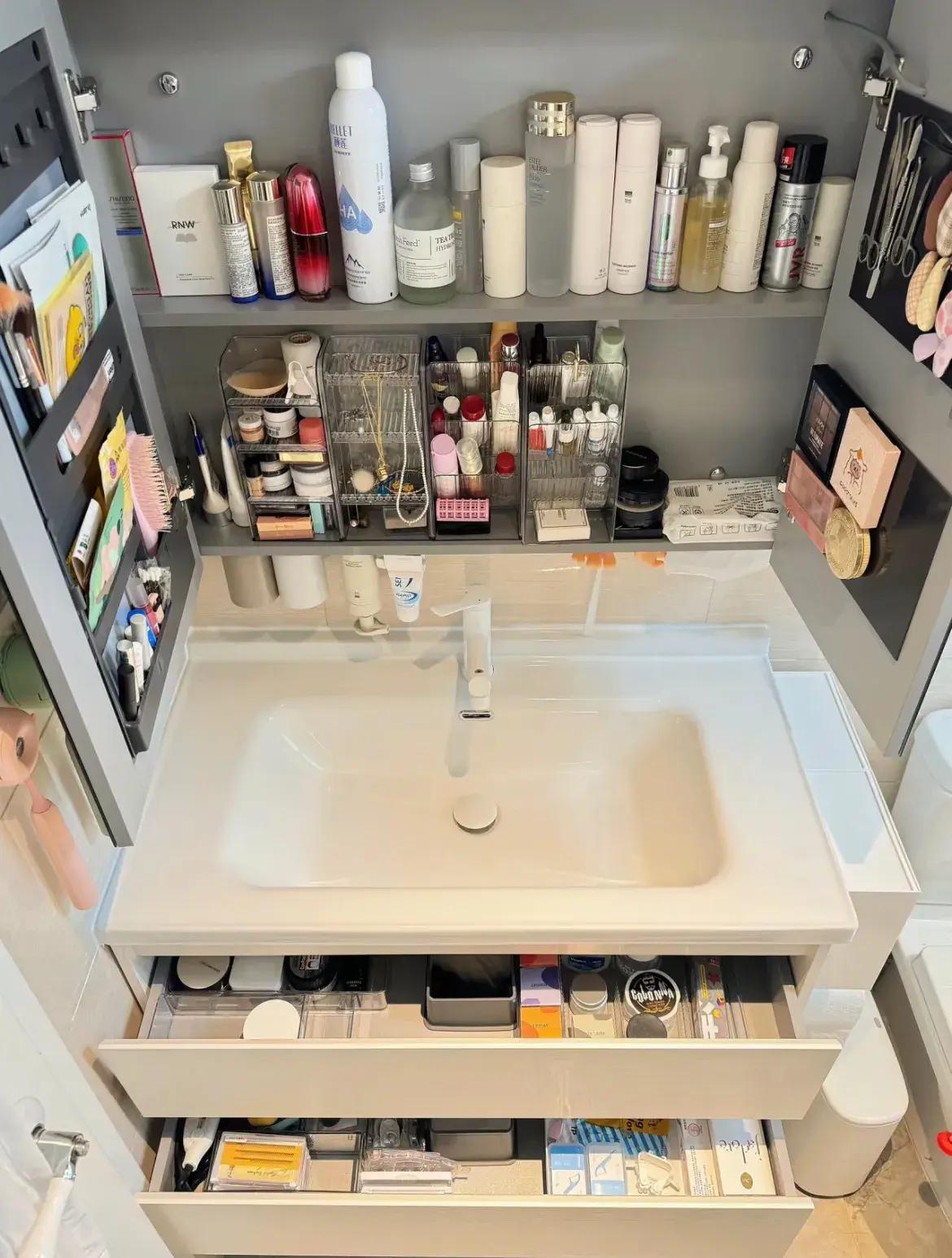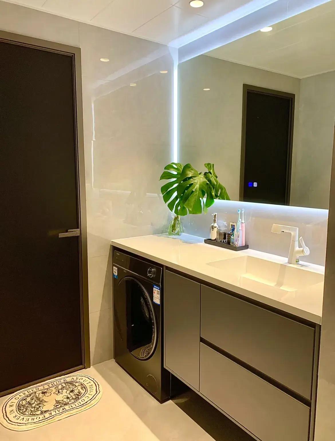 比如能做鏡櫃的就不要薄鏡,洗漱臺就能倖免物品堆積,空無一物的檯面看着乾淨,清潔起來也簡單。