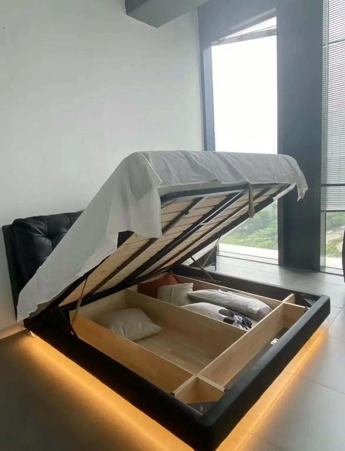 至於牀,可以如下圖,落一部分、懸一部分,既沒有衛生死角,又多了一些儲物空間,對於收納緊張的家庭極其友好。