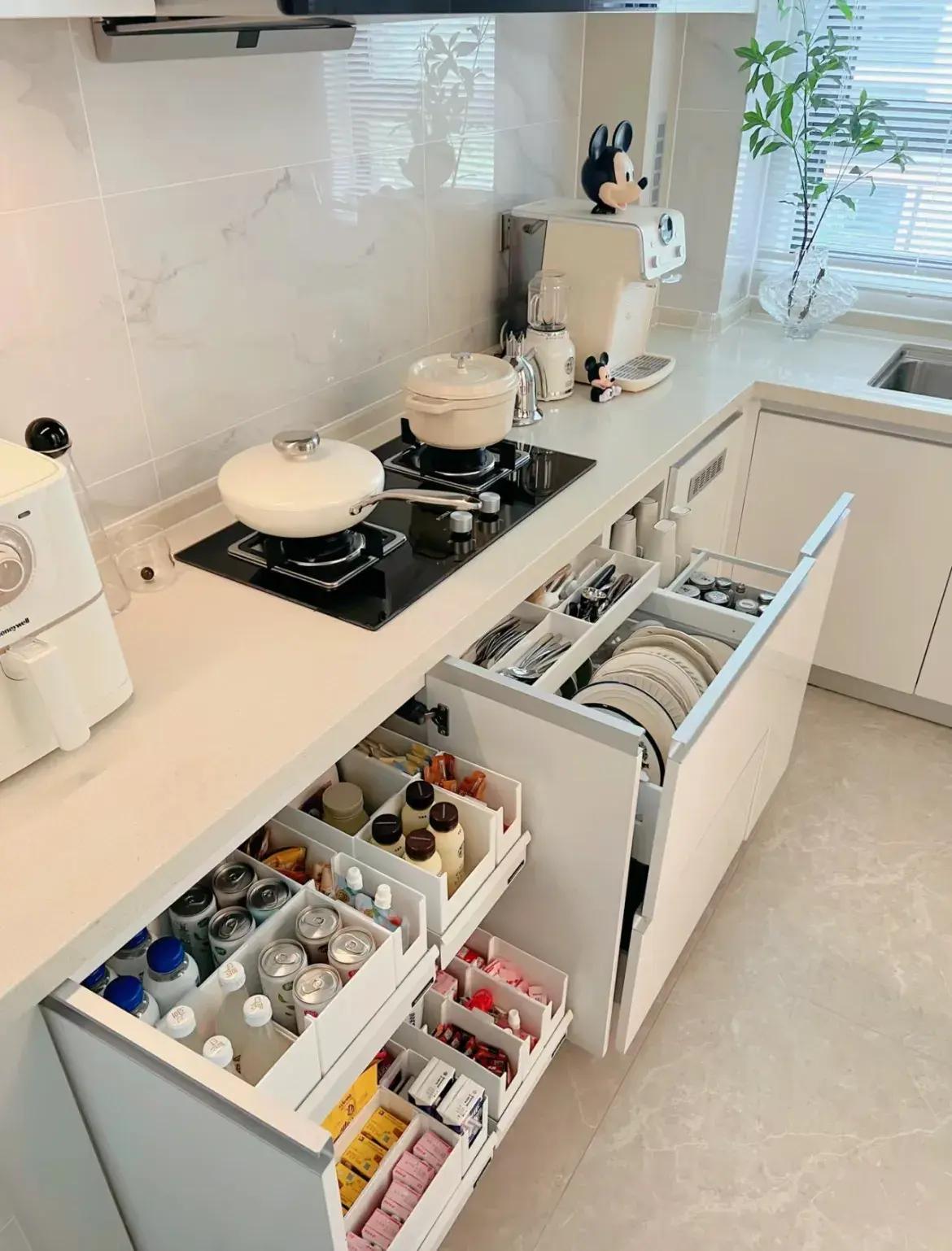 廚房,小件物品多,多做抽屜,收納好分類又直觀,少了小工具的牆面、少了瓶瓶罐罐的檯面,看着乾淨,擦着也爽。