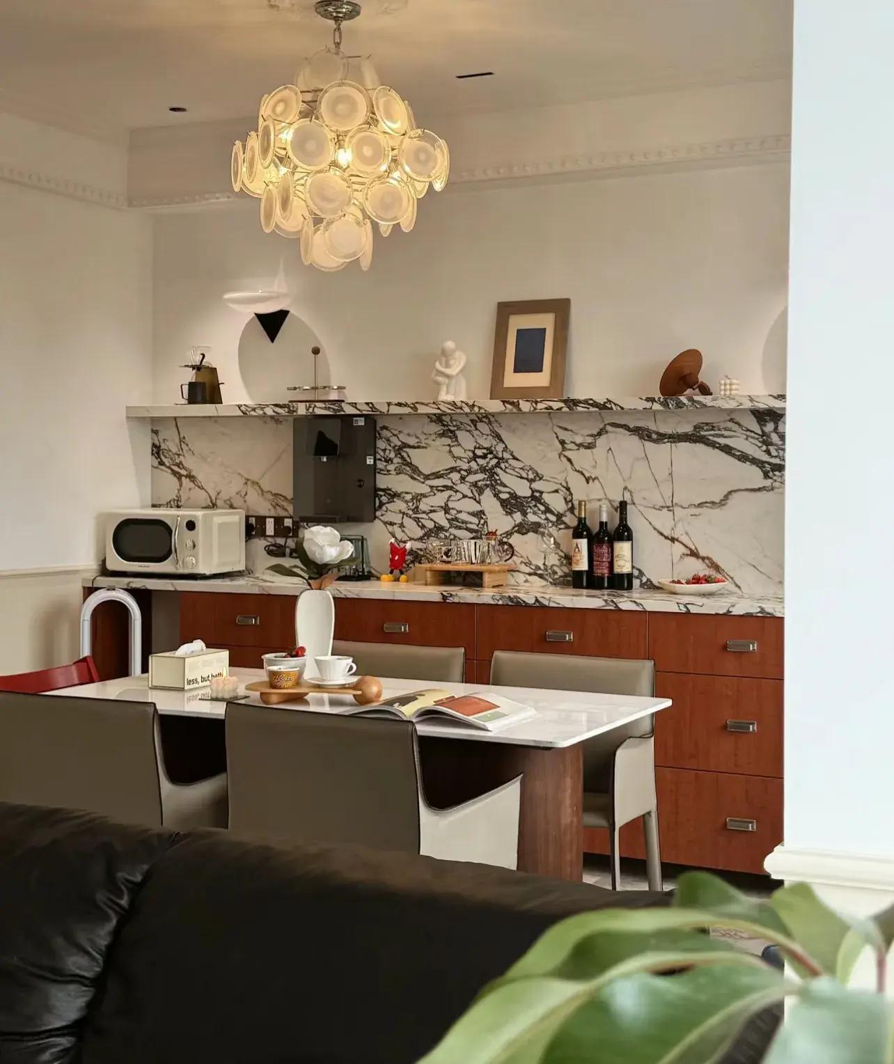 還有這種餐邊半櫃,搭配上翻石材的設計,是餐邊櫃,還可以作爲展示空間,不僅餐廳精緻中帶點浪漫,使整個家都散發着藝術氛圍。