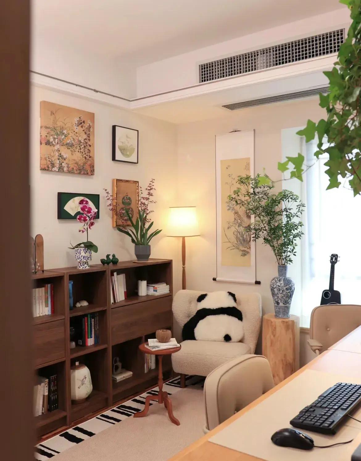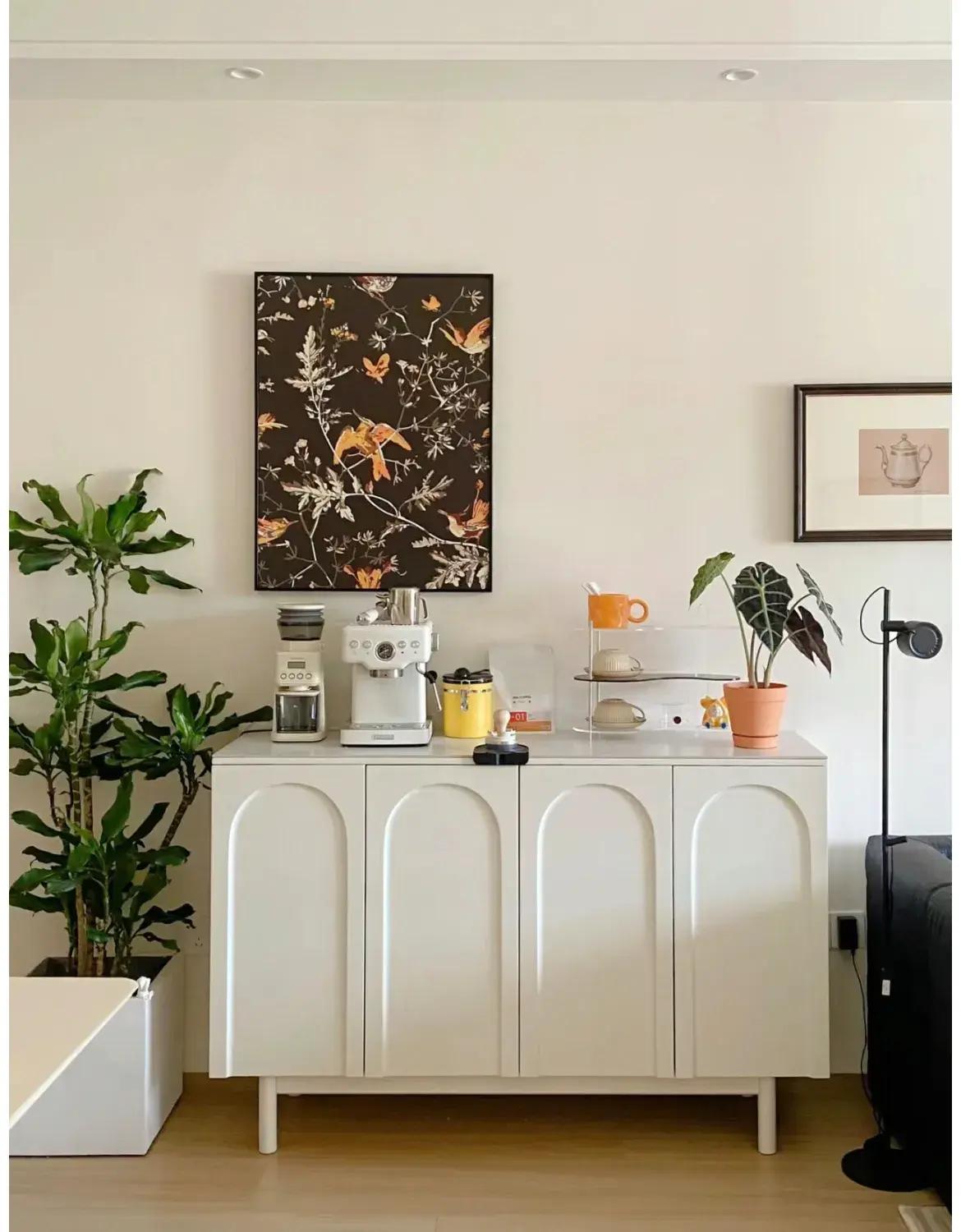 常見搭配方式,也是家居博主的萬能搭配公式,通過畫作分割比例,兩側再點綴些綠植,瞬間讓整個餐邊櫃區域,有調性又有生機。