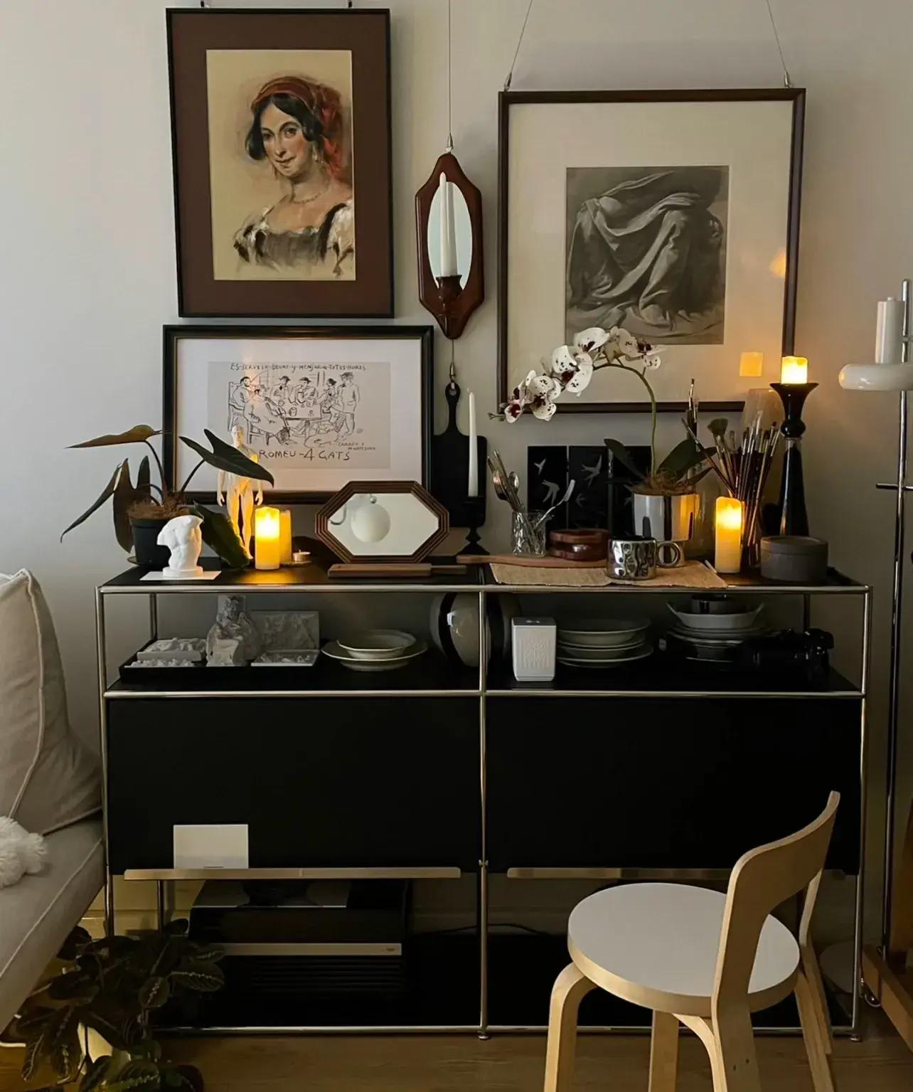 甚至再簡單點,畫都 不用掛,直接蹲在餐邊櫃上,調性就有了,層次感還爆表。