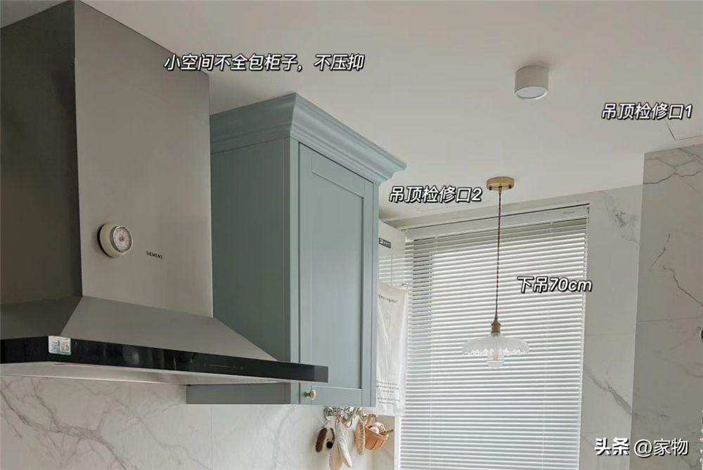 吊頂部分,特意留出了油煙機位置,並沒有把它全部都包到櫃子裏,雖然一定程度上破壞了一體感,但實則釋放了空間,畢竟只有5㎡,若全包會覺得比較壓抑。