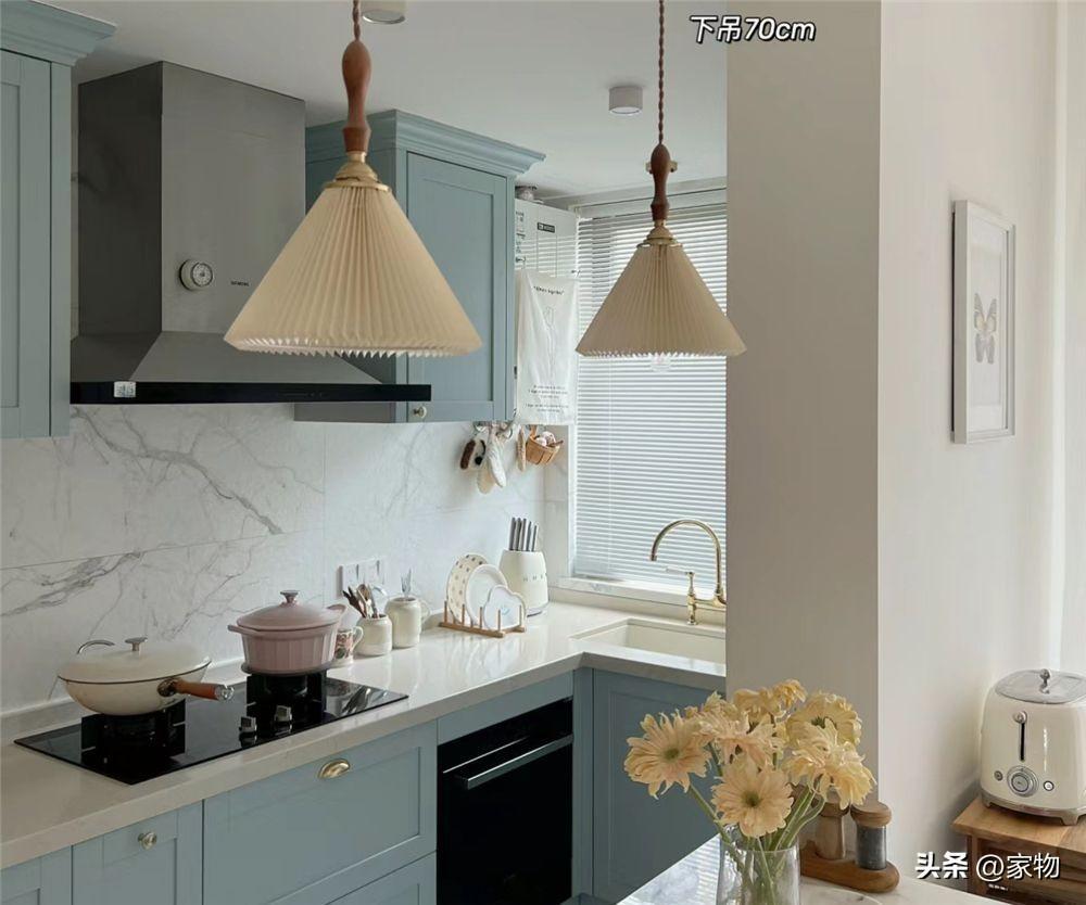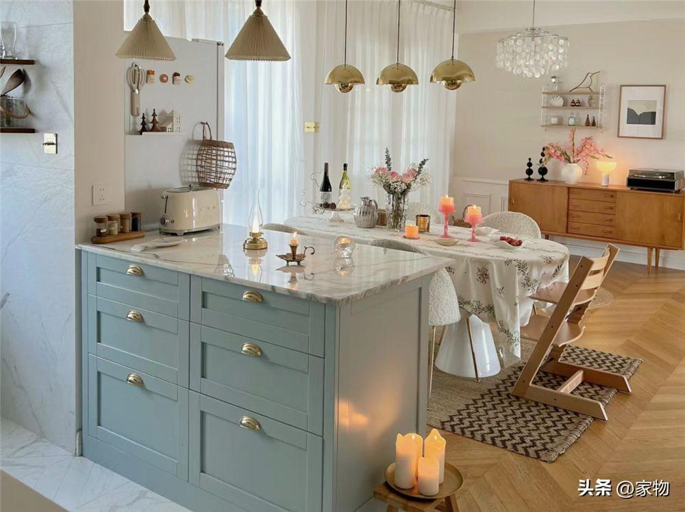島臺位置的吊燈下吊70cm,這個高度既可以顧及到照明,又是專屬於島臺位置的檯面照明,坐在這裏喫個早餐,或者是辦公閱讀,都挺舒服,讓廚房擁有了更多靈活功能。