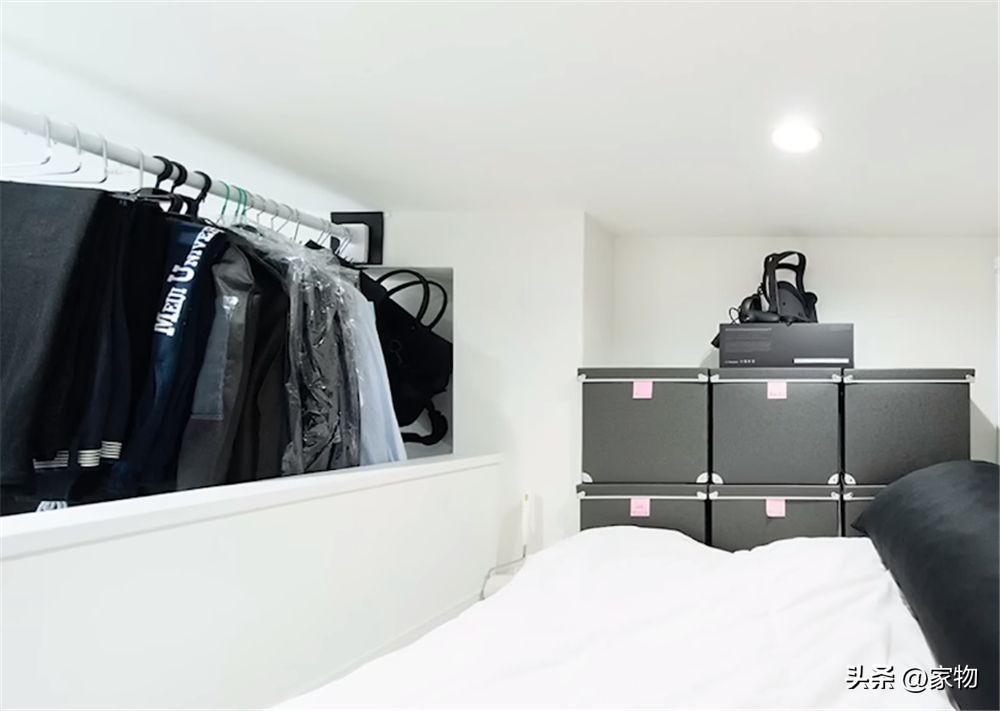 撐杆式的搭衣架,就掛在隔層護欄外面,不僅是額外的收納,還相當於臥室的窗簾,一物兩用,個人感覺對於這間納米房來說實用性還是非常強的。