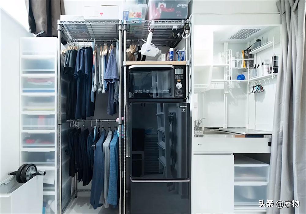 書桌後面,就是一整組的衣櫃架了,大多空間都留給衣物收納,還用堆疊的收納盒收納小件衣物,但也在靠近廚房一邊留下了嵌入冰箱和微波爐的位置,方便收納食材和熱速凍食品。