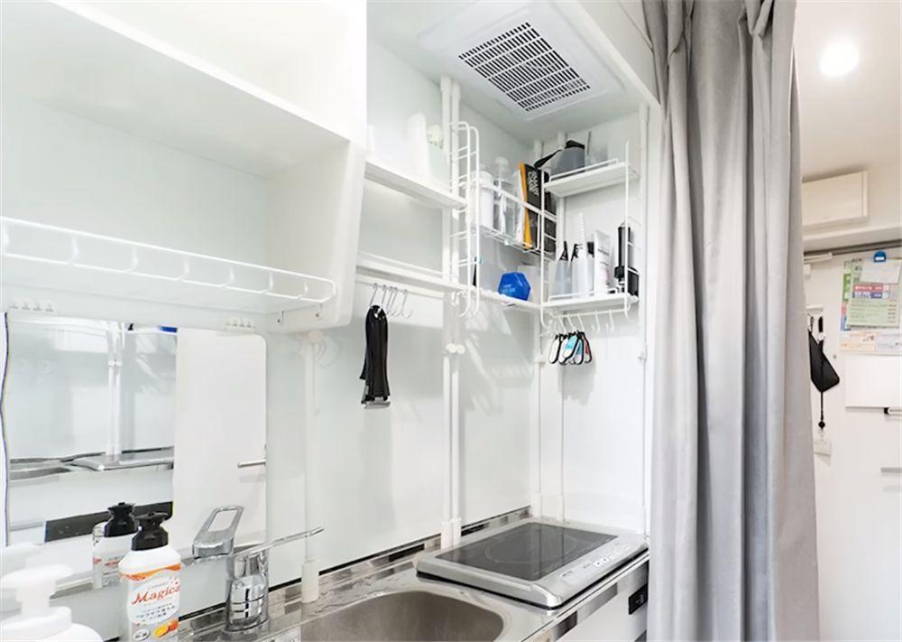 廚房的檯面非常小,甚至沒有切菜的操作檯面空間,一側做成水槽,另一側用電磁爐代替傳統明火竈臺,讓我沒想到的是,上面還有一臺小小的油煙機,29歲的菅野博志下班後偶爾也會在家自己做飯,但大多時候還是便利店居多。