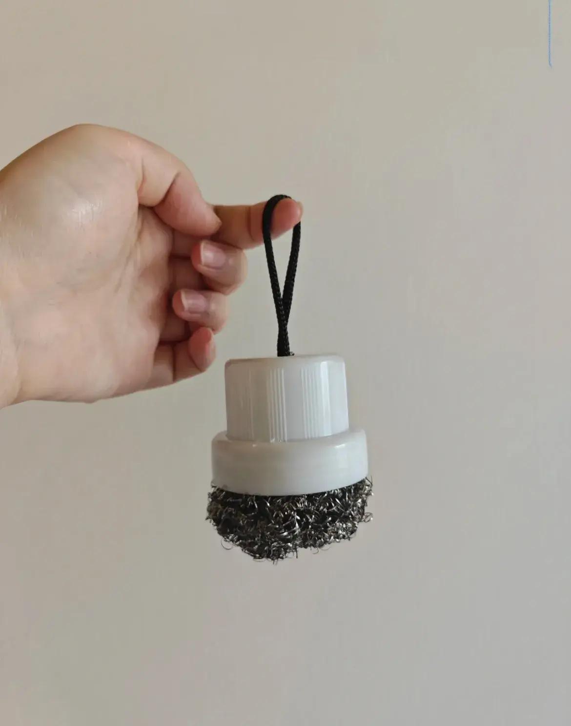 用完的洗衣液蓋子,上面穿個孔,然後用皮筋套上鋼絲球,穿過蓋子,一個既有手柄又有掛繩的鋼絲球配套就搞定了。