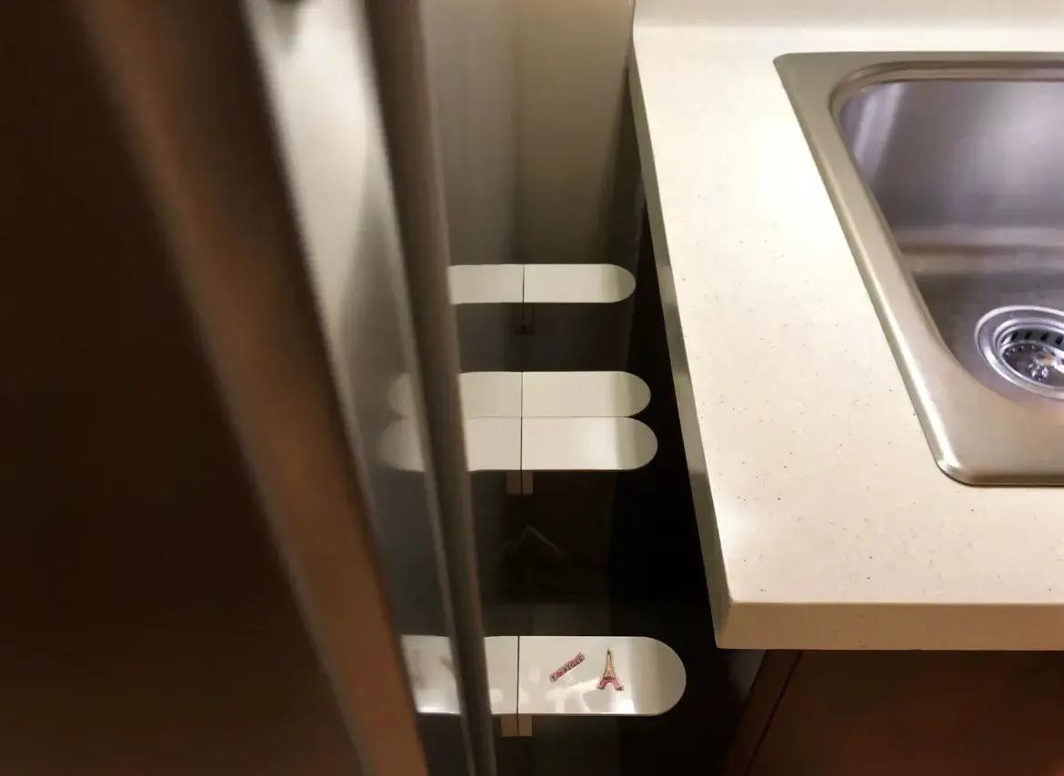 用極窄垃圾桶,底下搭配上垃圾桶懸空底座,粘貼高度把握好與檯面齊平,出來還真的與檯面嚴絲合縫。