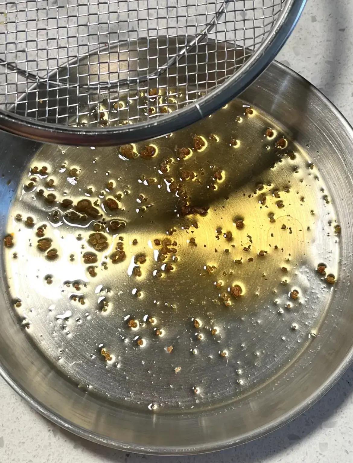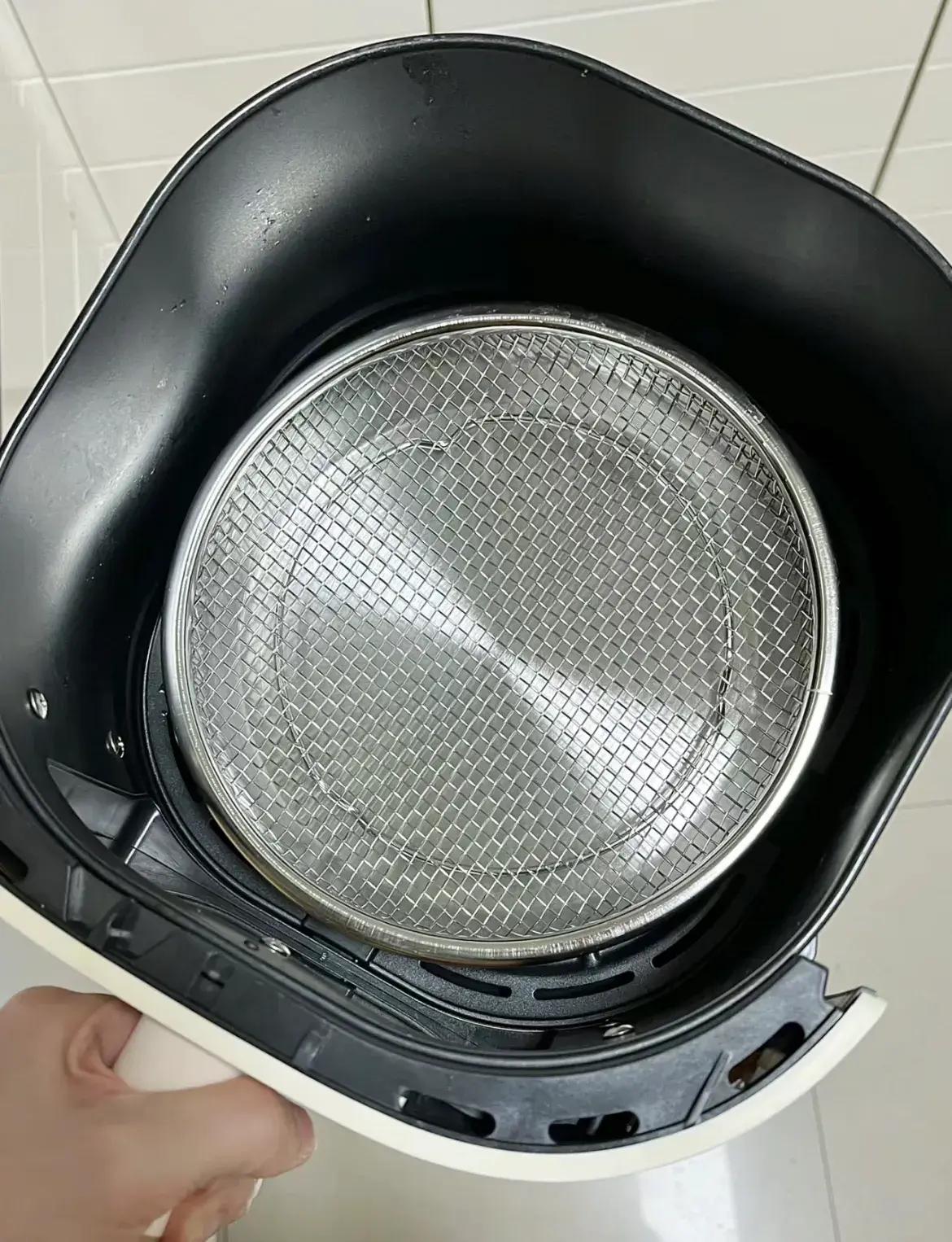 將不鏽鋼盤和瀝網搭配起來,放到空氣炸鍋裏。炸出來的殘油、殘渣會落到盤裏,炸鍋本身就能免髒。