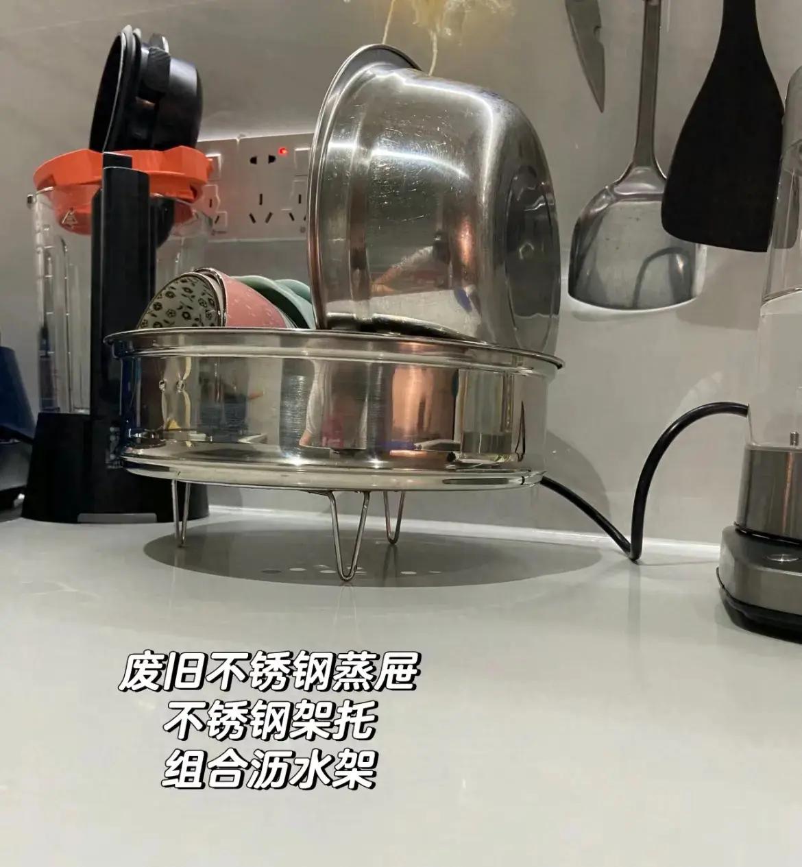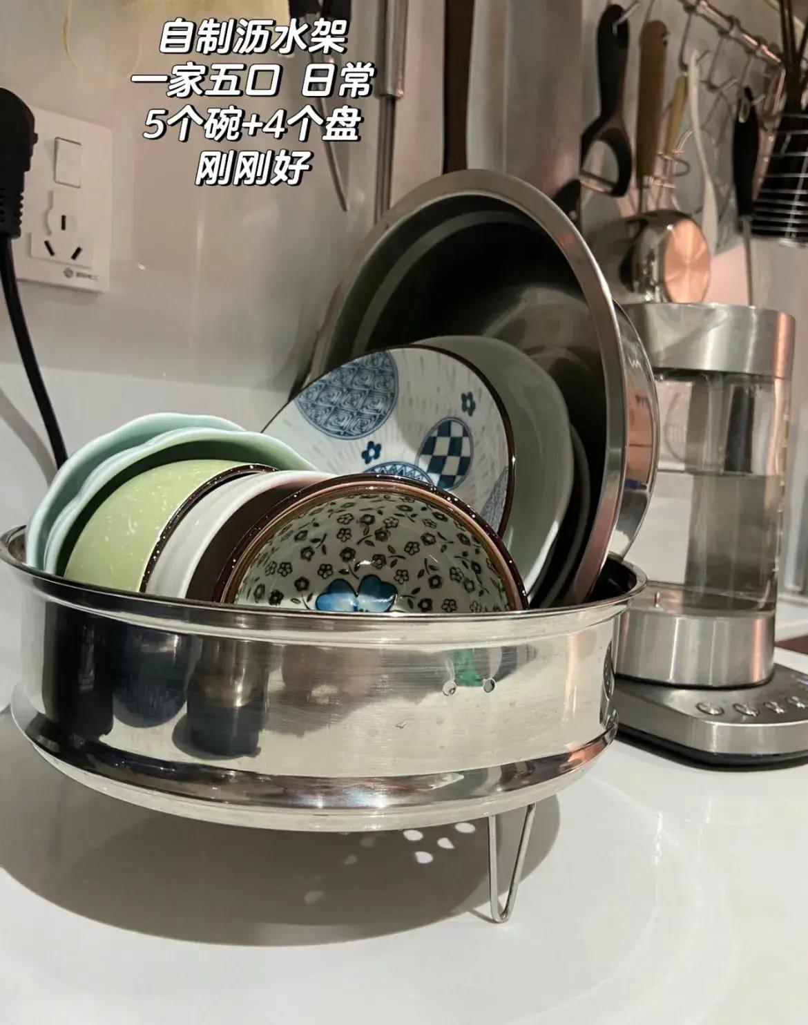 只見她走到廚房,拿出蒸饃鍋上的屜子,再架上餾饃用的不鏽鋼架,一個“智慧版”的瀝水架就誕生了。
