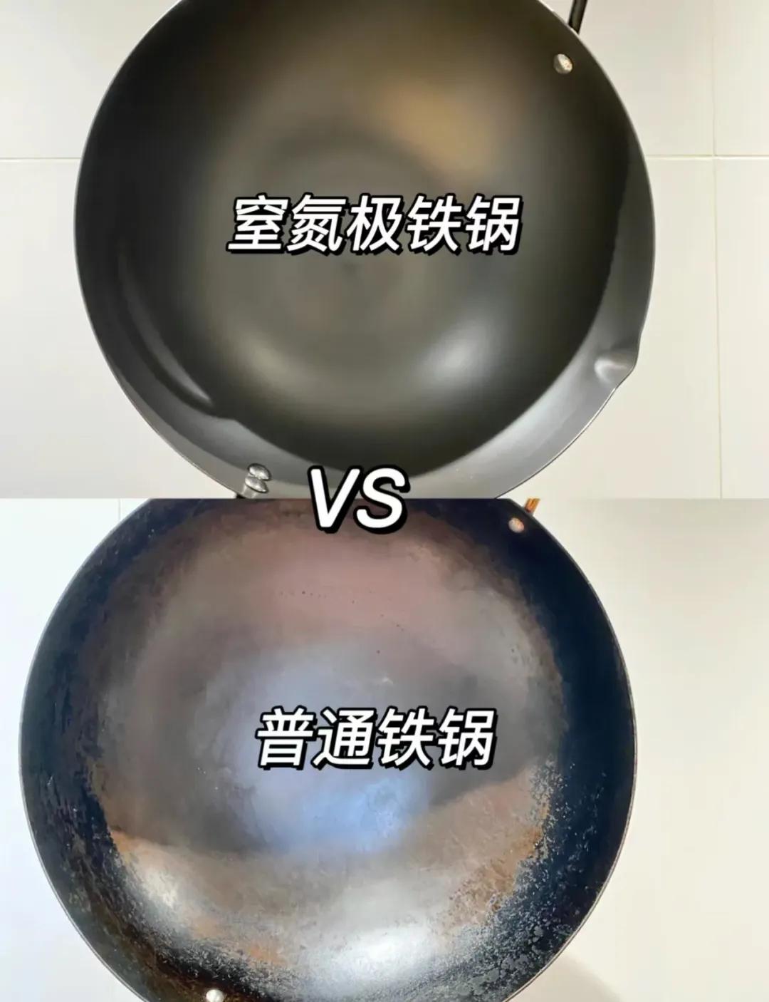 窒氮熟鐵鍋,採用的窒化工藝(又叫氮化處理),在鐵鍋表面形成氮化層,不易生鏽,防腐蝕,表面硬度高,具有很好的耐磨性和耐高溫性;輕便導熱快,適合爆炒,使用壽命相對較長,不易受到劃痕和刮花,屬於大廚用鍋。