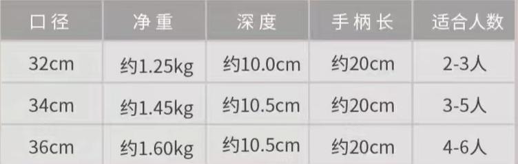 鐵鍋口徑一般選擇34cm, 適合3-5人的大多數家庭。