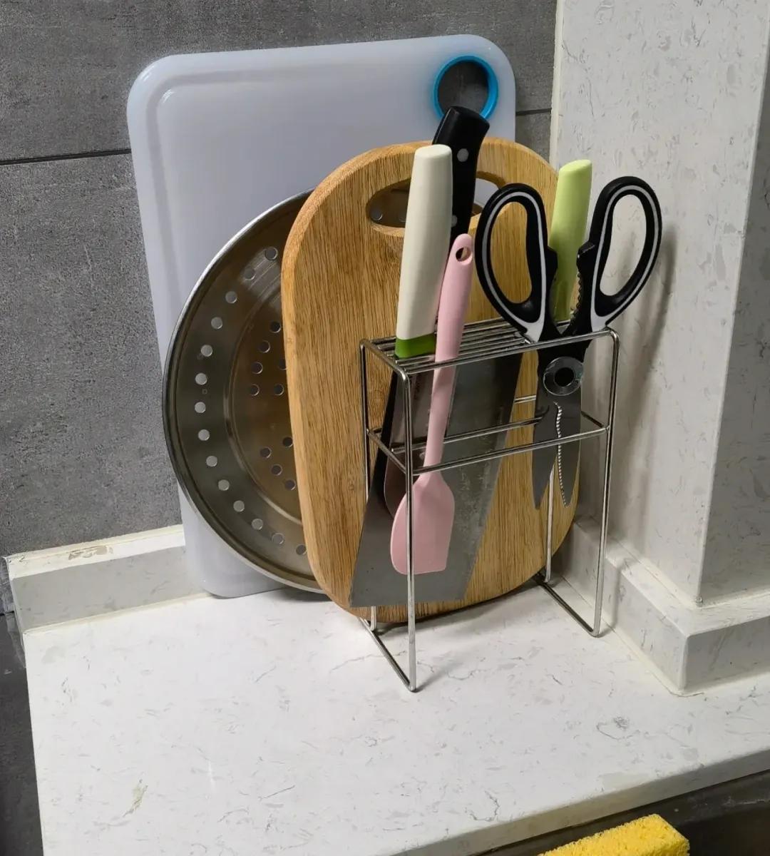 有的不鏽鋼架子除了放刀具,還能放砧板,剪刀。刀露外面好瀝水,也不會滋生細菌。