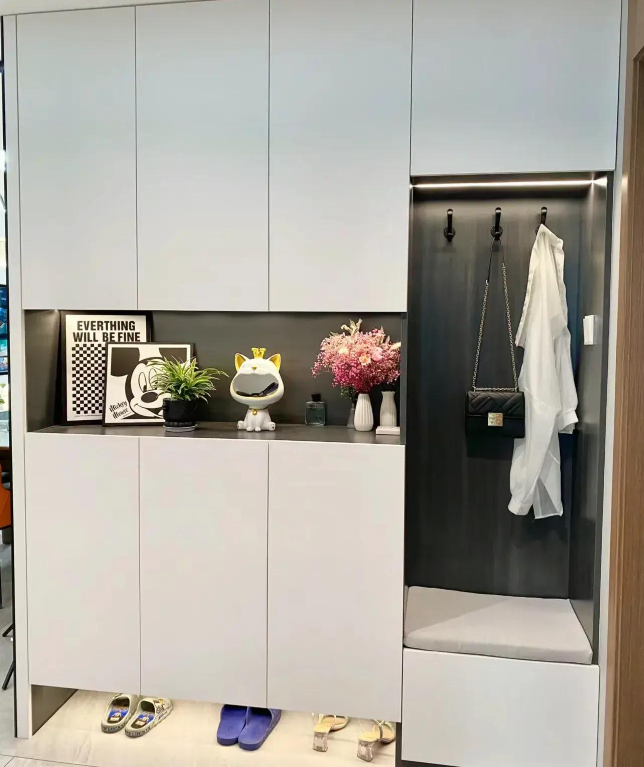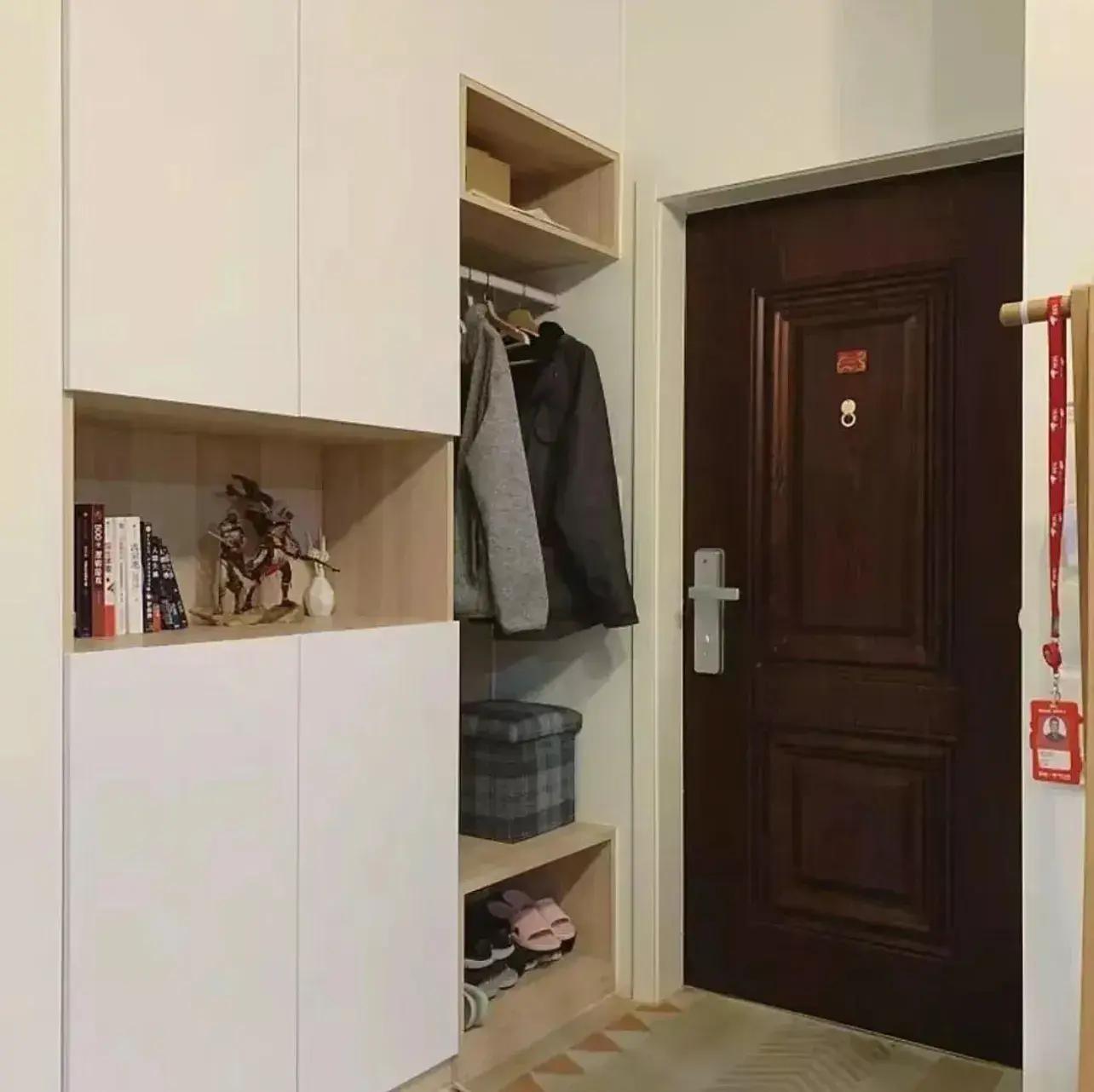 說的是,小戶型神設計,做了櫃子一體換鞋凳之後,這個地方又能掛衣服,又能坐着換鞋。