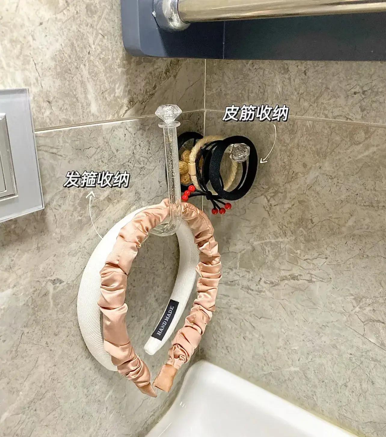 貼在衛生間一角,存在感很低,又能解決髮飾亂放的問題,甚至環形耳飾,也能隨手穿在上面。