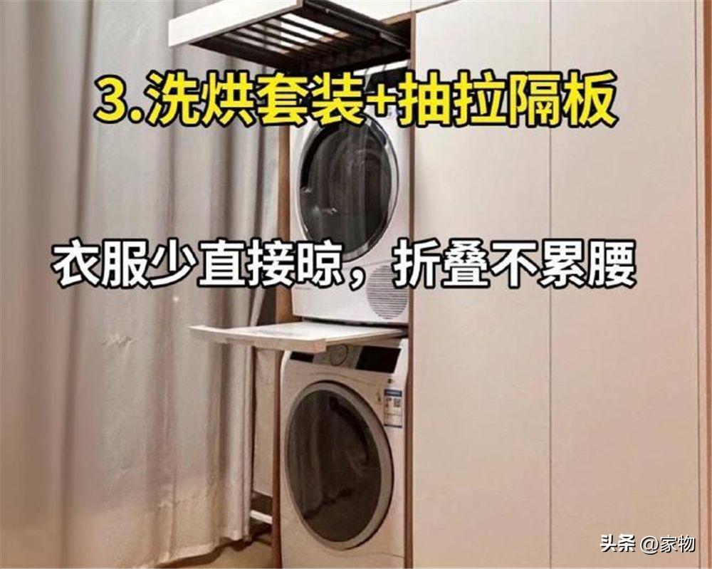 陽臺本來就不大,再加上感覺洗手檯沒用,就乾脆一邊做櫃子,一邊嵌入洗烘套裝和抽拉隔板,通常情況下,根本不用仔細考慮晾曬的問題,衣服少的話可以直接在隔板上收拾晾曬,很方便。