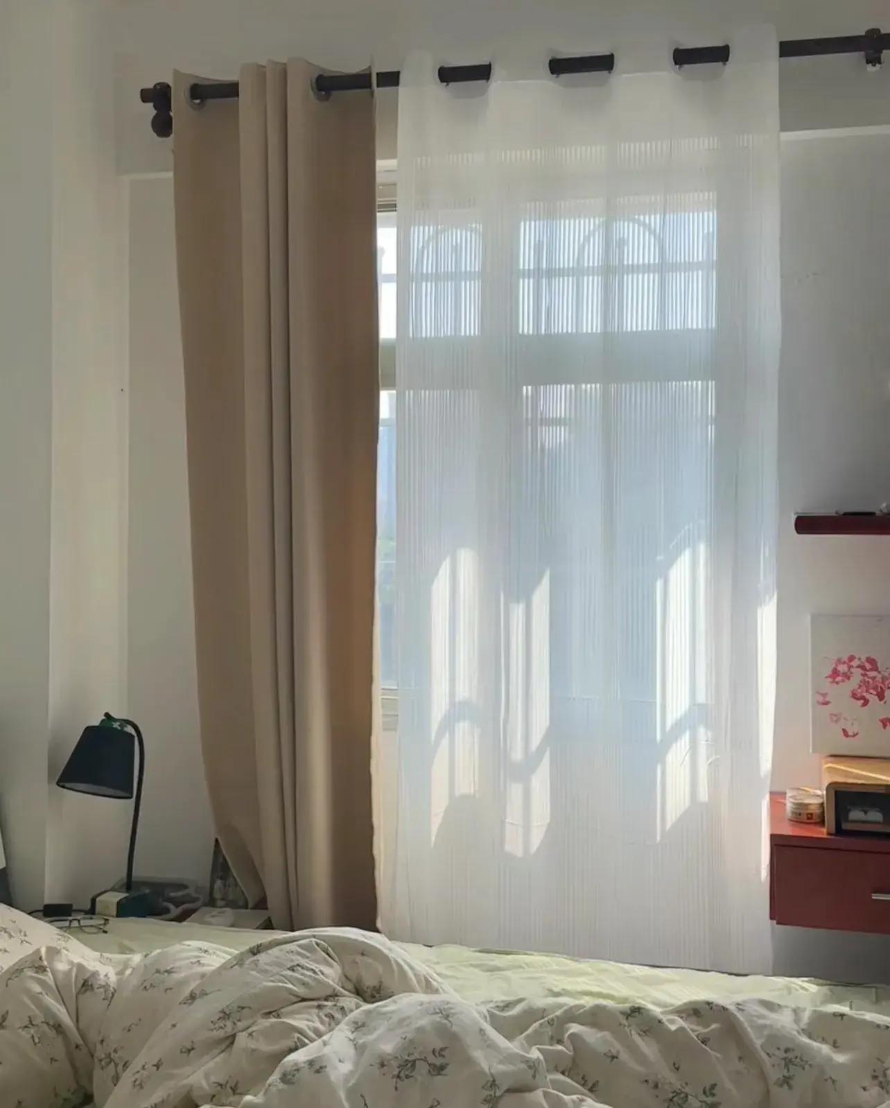 很簡單,就換成一片薄紗一片窗簾遮光布的這種,百元以內,就能讓家裏顏值提升個檔次。