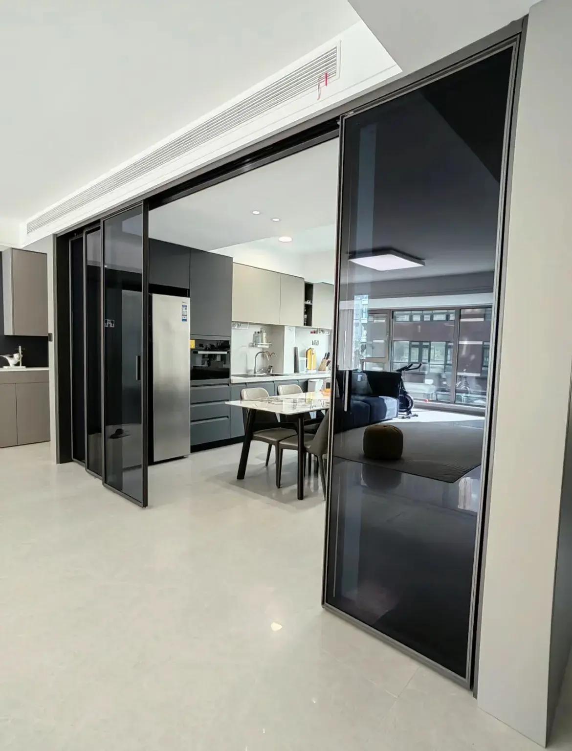 想着地軌不好清潔,特意選擇了價格貴點的吊軌推拉門,再考慮到整體美觀度,加錢做了極簡窄邊框。